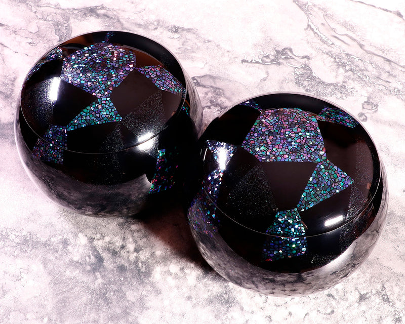 These Go bowls are specially commissioned works crafted by Kyoto-based urushi (lacquer) artist Mutsumi Oitate, featuring an intricate mosaic raden (mother-of-pearl) inlay design.