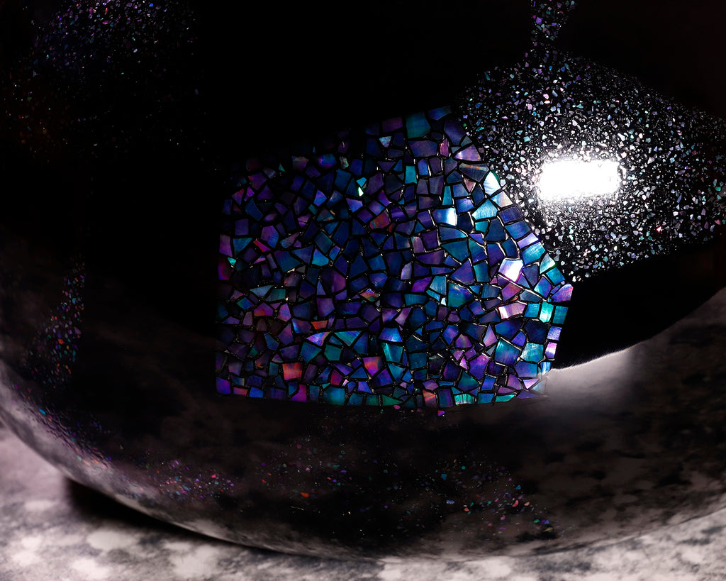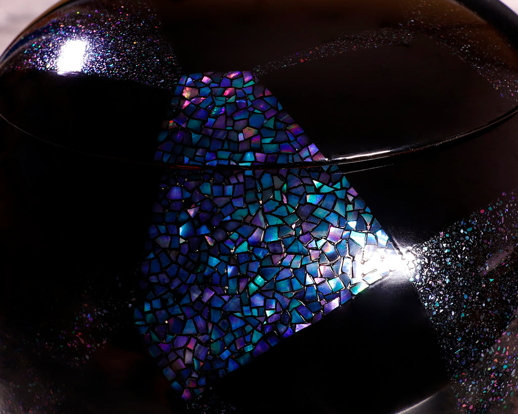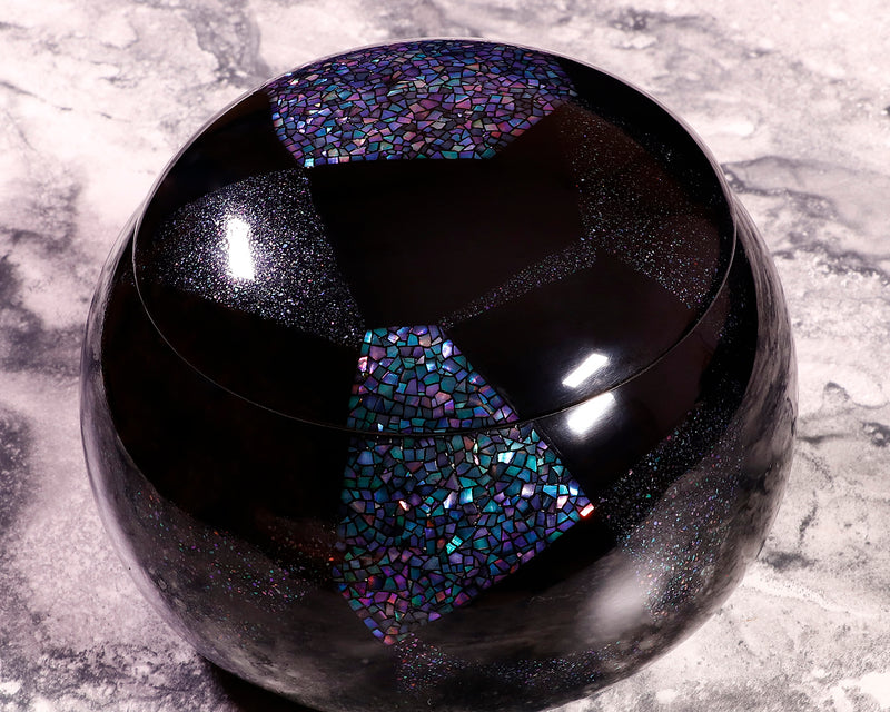 The interior is finished with vermilion urushi, while the exterior is coated entirely in black lacquer. Scattered across the surface are mosaic patterns of various sizes created through exquisite raden craftsmanship.