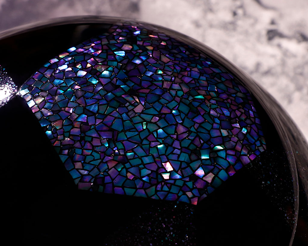 These Go bowls are specially commissioned works crafted by Kyoto-based urushi (lacquer) artist Mutsumi Oitate, featuring an intricate mosaic raden (mother-of-pearl) inlay design.