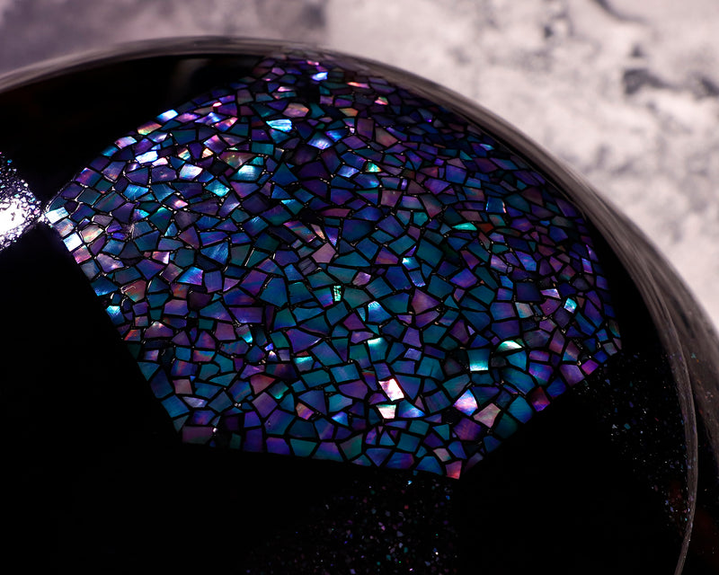 Because Go bowls have a curved surface, large pieces of raden inlay can sometimes lift or detach. To prevent this, each shell was carefully cut into smaller pieces and applied one by one, like a puzzle.