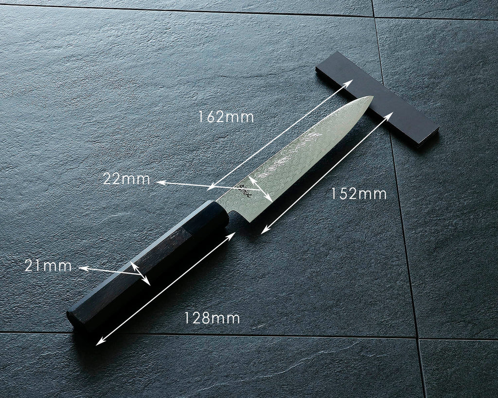 This Petty knife features the distinctive and elegant pattern unique to Damascus steel.