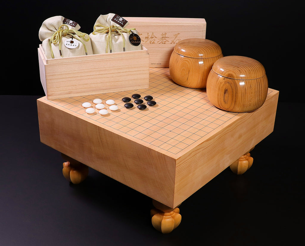 Manager's Recommended Luxury 3-Piece Go Set - ⑦ 【Shin-Kaya (Spruce wood) Go board with legs, clamshell Go Stones and Honkuwa [Mountain mulberry] Go Bowls】