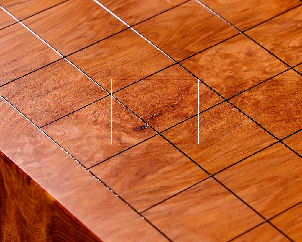 As it is made entirely from oil-figured wood, not only the top surface but also the bottom, ends, and sides display delicate and intricate grain patterns, giving it a unique appearance distinct from ordinary Go boards.