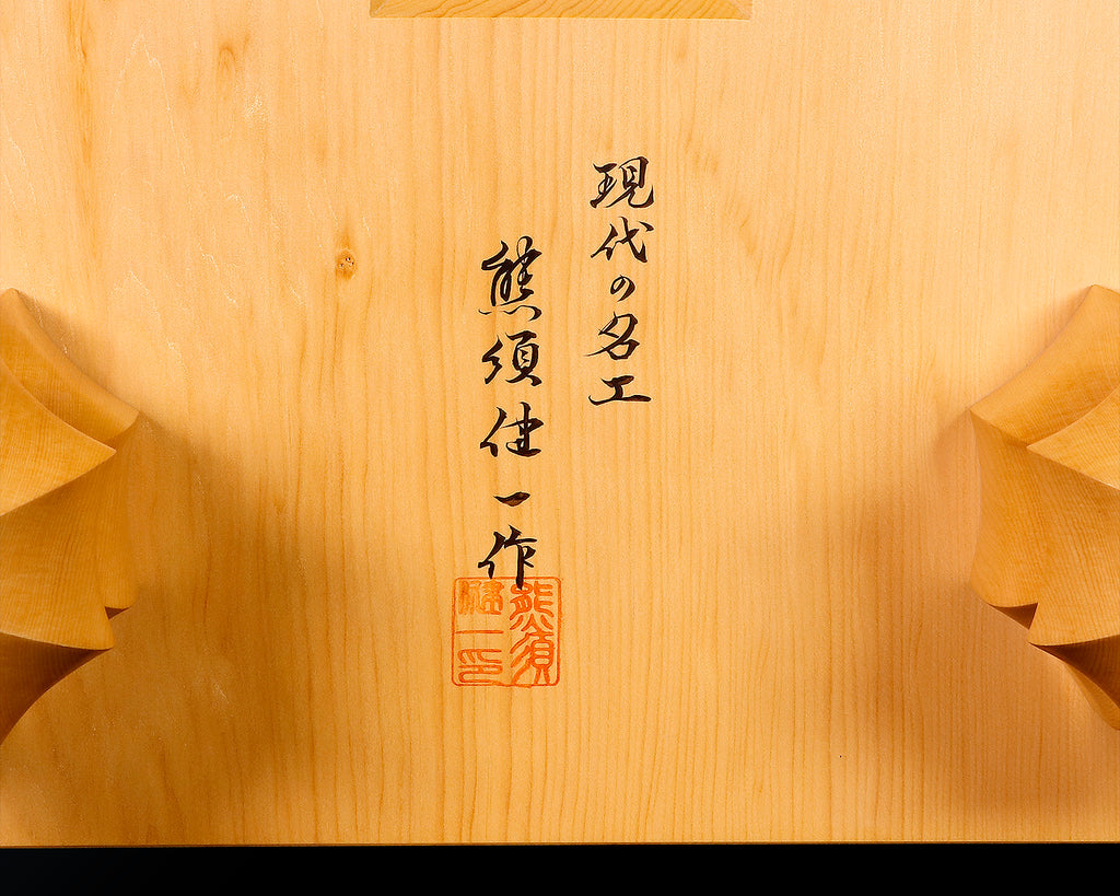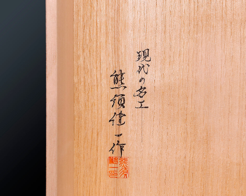 Includes a paulownia wood cover bearing the same inscription, ‘Crafted by Kenichi Kumasu, Contemporary Master Artisan,’ with his seal on the inside.