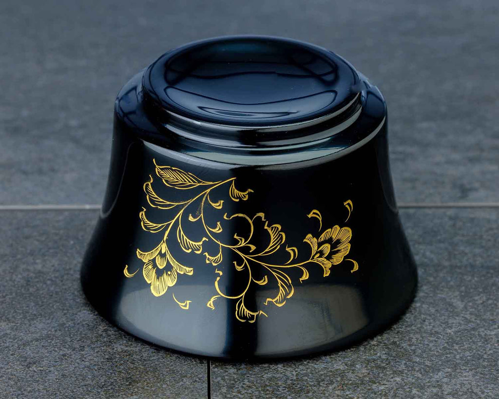 This is a Wajima-nuri sake cup featuring the elegant Housouge (sacred floral) design in gold.