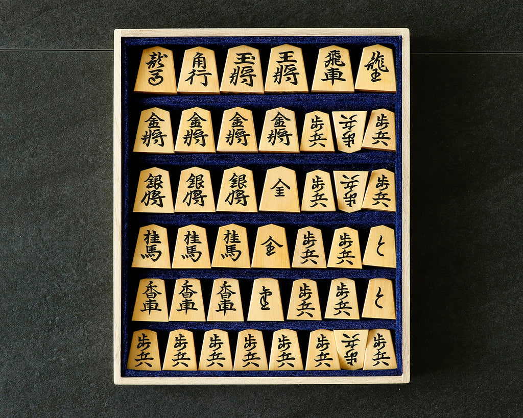 These shogi pieces are crafted from Aka-Masa grade Shima Boxwood, featuring beautifully raised and rounded characters in the Kiyoyasu-sho calligraphic style.