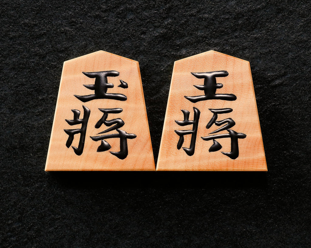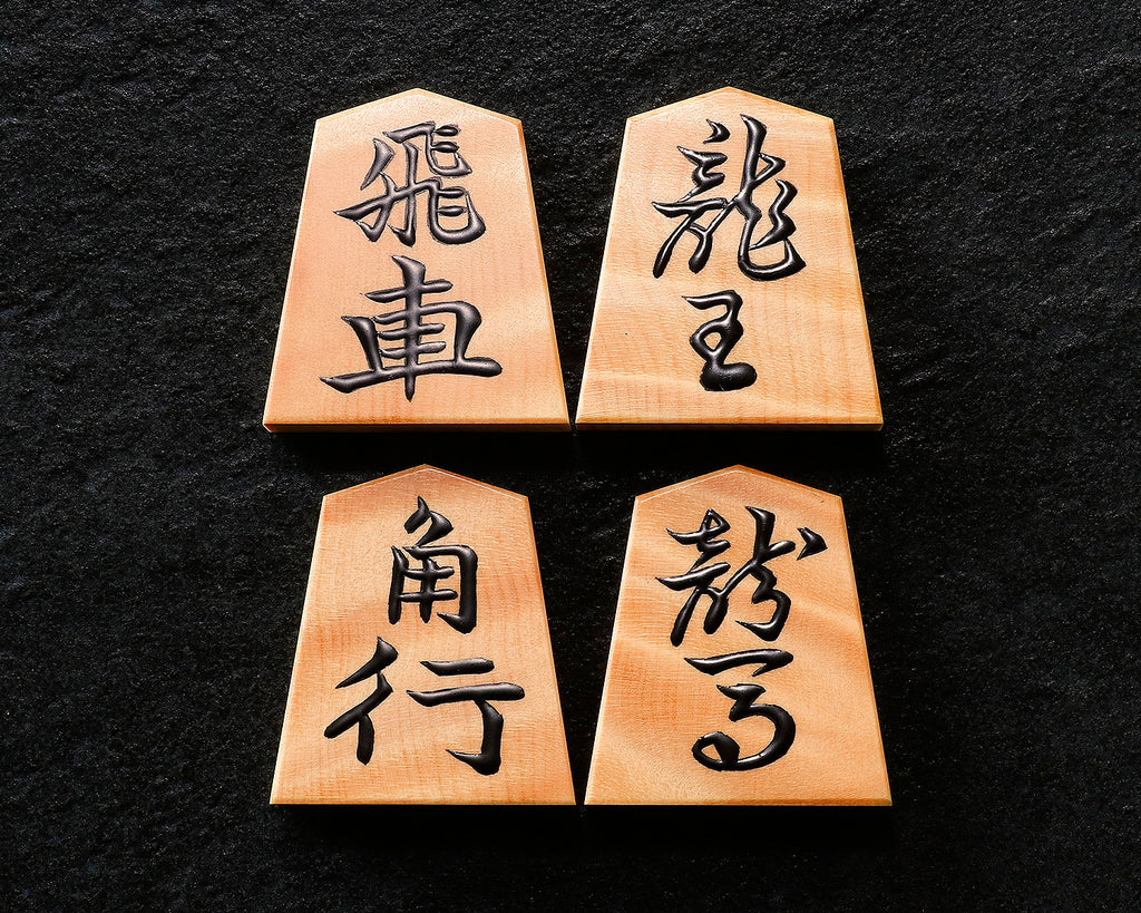 Shogi pieces types : Mori-age(Embossed) 盛上げ駒 'Mori-age-koma' is a piece made by filling the engraved characters with lacquer, and after drying and polishing the surface flat, finishing by using a brush to add more lacquer on top of the engraved lacquer parts to give slightly raised characters.