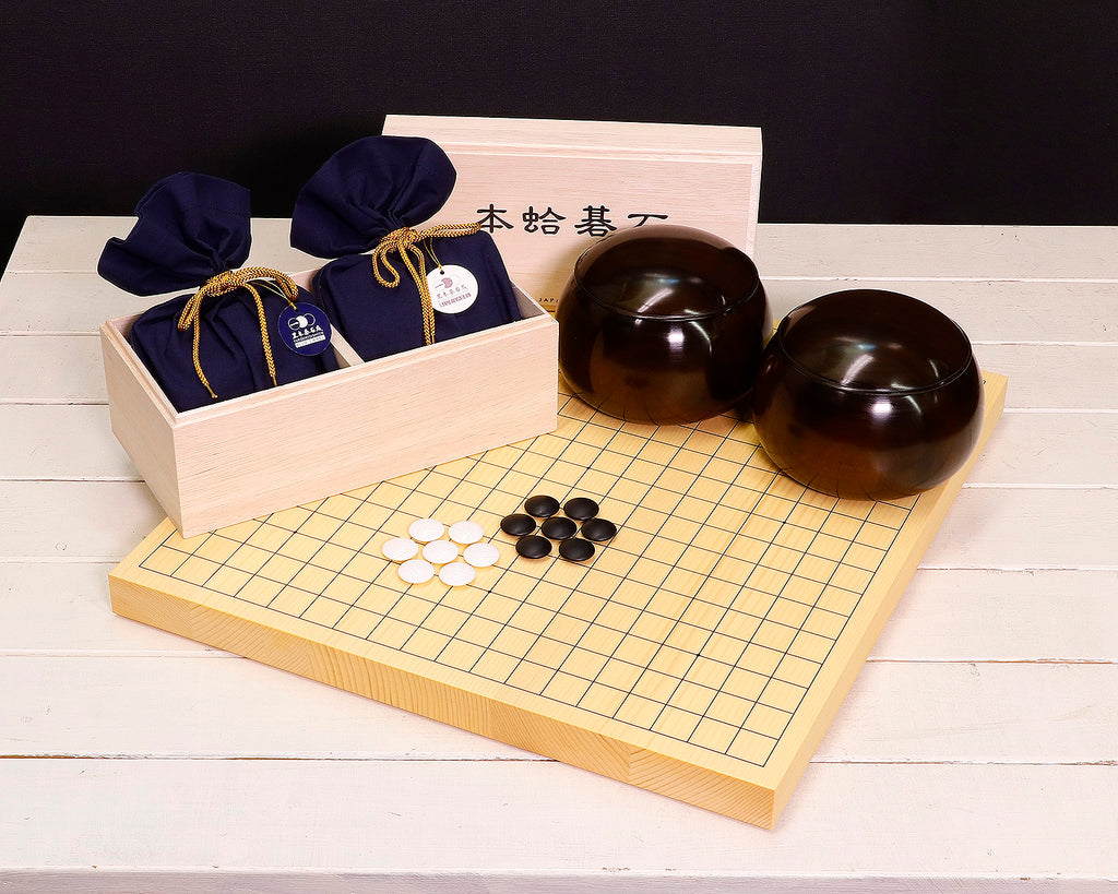 『January 5th "Igo Day" Celebration SALE』512-IGD-GS02 Go 3-Piece Set - Clamshell Go Stones Blue Label size31 + Kusu [Camphor] Go Bowls + Shin Kaya [spruce] wood made Table Go Board Size10