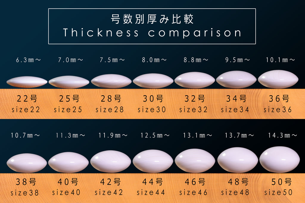 Generally, the thickness of Go stones that are said to be “easiest to play” is “size 30 to 36", so a Go stone of size 3 (thickness: approx. 10.1 mm) combine sufficient thickness with excellent playability, making them comfortable and easy to handle during play.