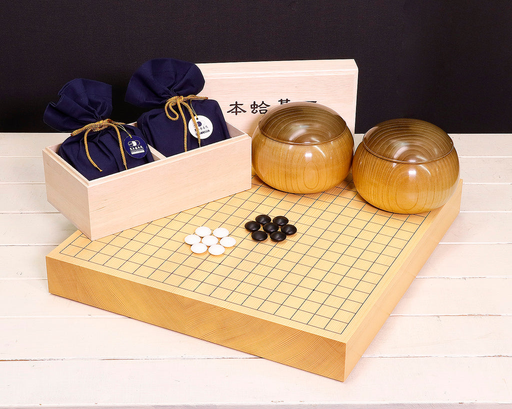 『January 5th "Igo Day" Celebration SALE』512-IGD-GS04 Go 3-Piece Set - Clamshell Go Stones Blue Label size36 + Kihada / Amur cork tree Go Bowls + Shin Kaya [spruce] wood made Table Go Board Size20