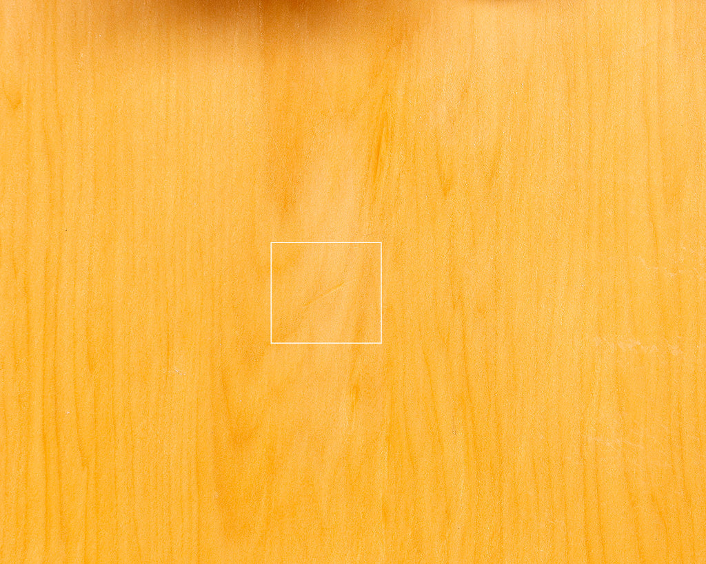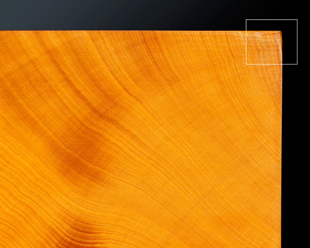 There is a dented mark on one top corner, natural discoloration stains on both end grains, habushi marks on one end grain and on the bottom, and scratches on the bottom surface.