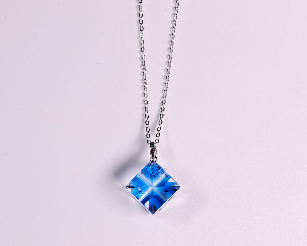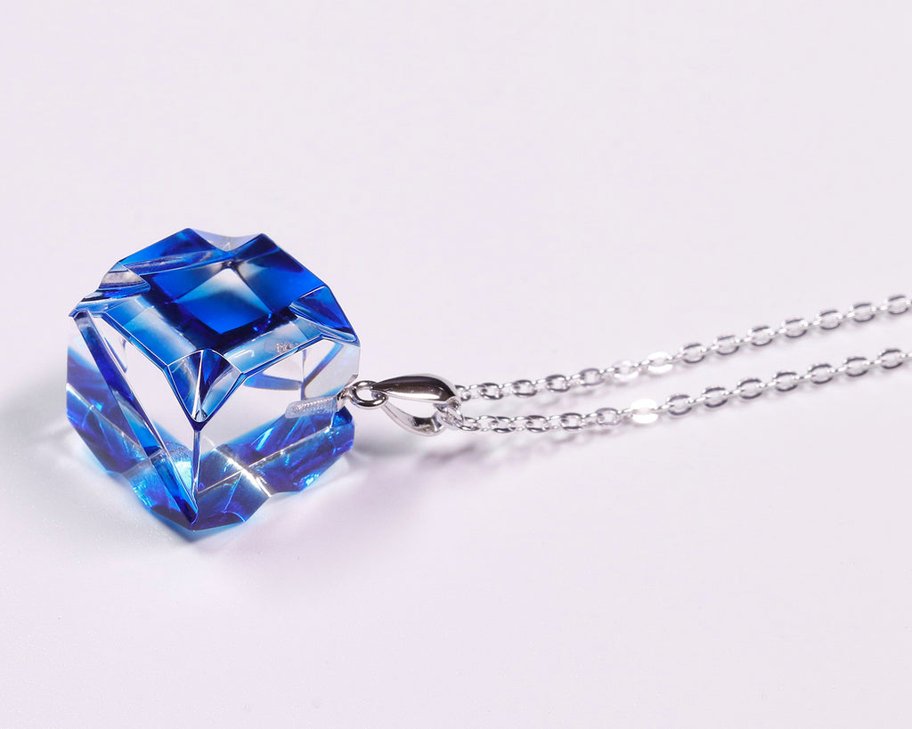 A pendant designed with cube-shaped crystal glass, intricately engraved in a lattice pattern to create a three-dimensional effect.