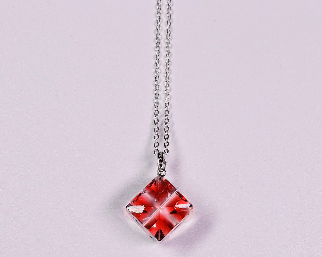 A pendant designed with cube-shaped crystal glass, intricately engraved in a lattice pattern to create a three-dimensional effect.