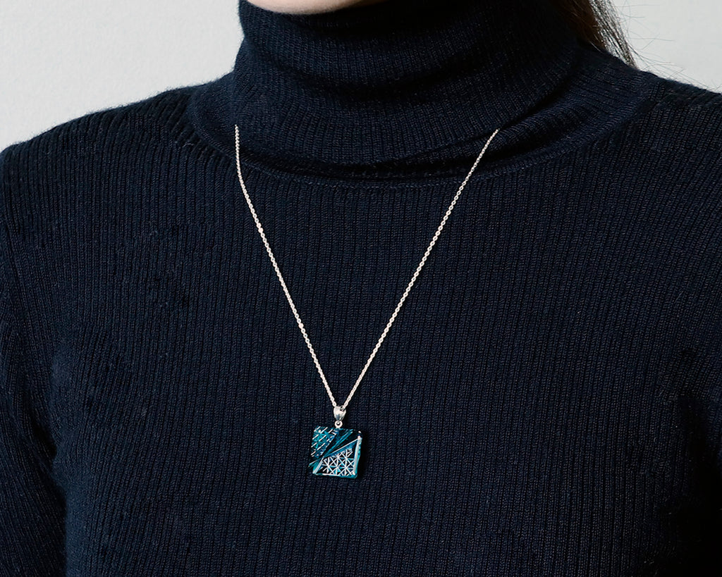 This “Two-Tone Pendant – Hikari-e (S) / Ruri–Green” is crafted from layered crystal glass composed of Ruri blue (a deep bluish-purple), green, and clear glass from the outside inward.