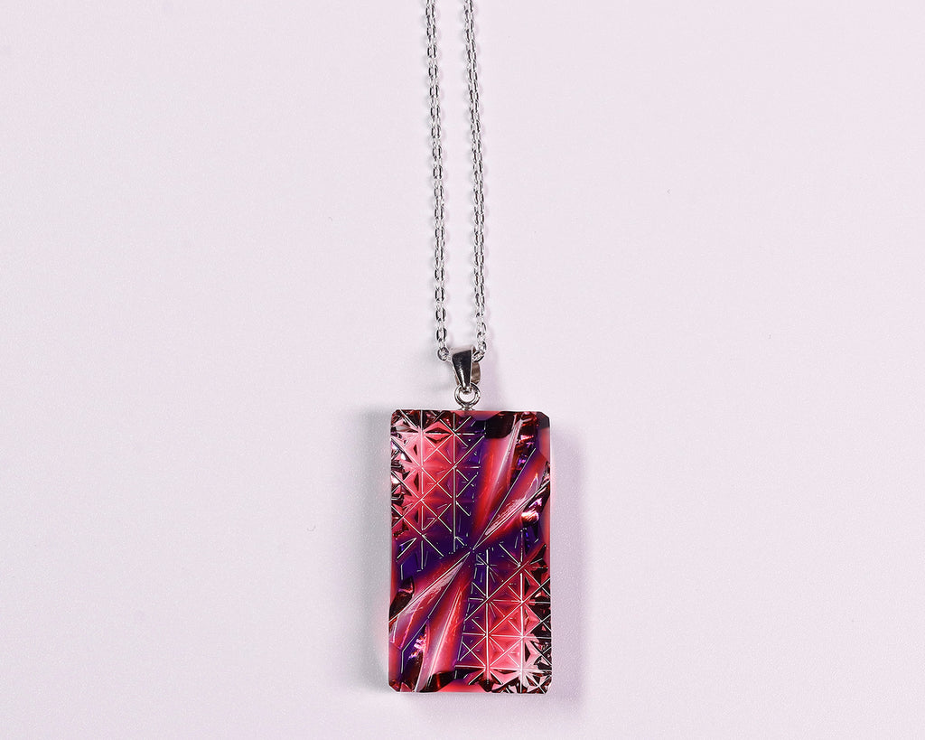 A pendant crafted from rectangular crystal glass approximately 9 mm thick, featuring a large cross and the traditional Asanoha (hemp leaf) motif, both expressed through three-dimensional engraving.