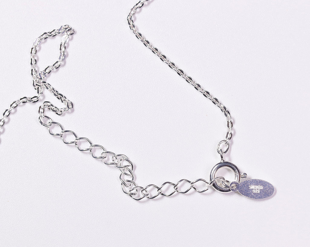 The chain is made of Silver 925, and the fittings connecting the chain to the pendant are crafted from 14k white gold.