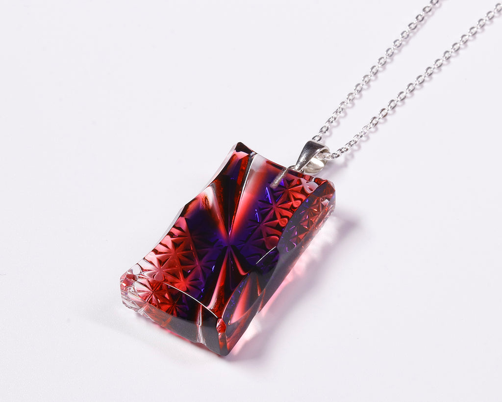 This “Two-Tone Pendant – Hikari-e (L) / Ruri–Kinaka” is made from layered crystal glass composed of Ruri blue (a deep bluish-purple), gold-red, and clear glass from the outside inward.