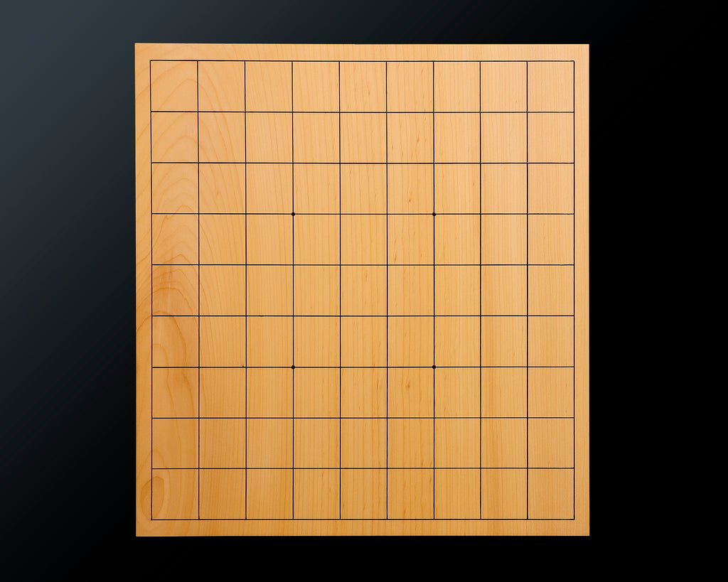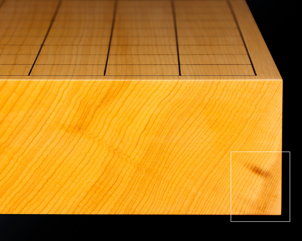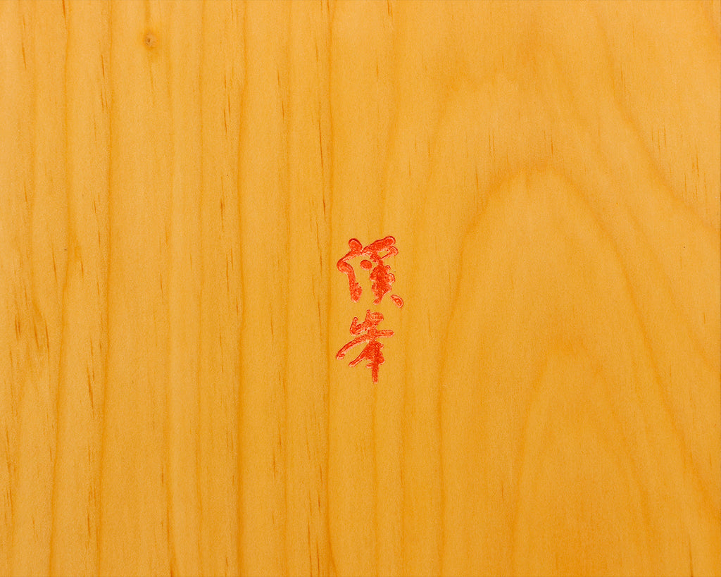Famous board craftsman Mr. Keiji MIWA made Japan grown Kaya 2.1-Sun 1-piece Table Shogi Board. It is engraved with a proof "Keiho" manufactured by Keiji MIWA. The lines of a board are marked using "Tachi-mori", the skill of drawing lines using a Japanese sword. This traditional technique highlights the beauty of natural grain patterns and the texture of lacquered line is smooth and has also a nice feeling.