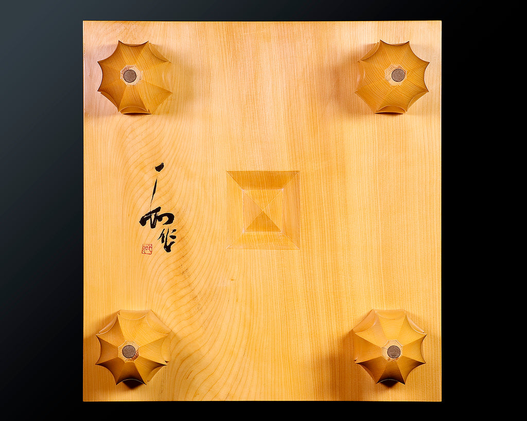 Currently, Hyuga kaya wood is extremely difficult to obtain, so Go boards with legs, which require large-diameter wood, are rare. This Go board is an exquisite piece that allows you to fully enjoy the fragrant aroma of Hyuga kaya and the soft texture of its wood, providing the ultimate playing experience. The lines are finished using domestically produced natural lacquer and are applied with the "tachimori" technique, using a Japanese sword. The thin, delicate lines characteristic of board craftsman Mr. Yoshida exude elegance and beauty.