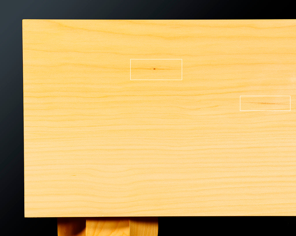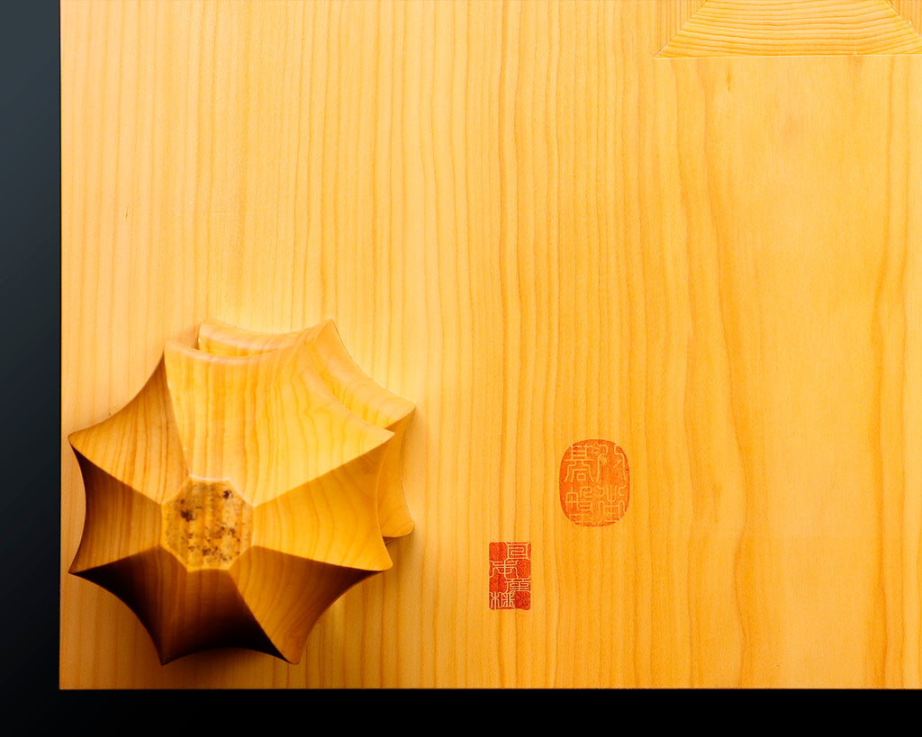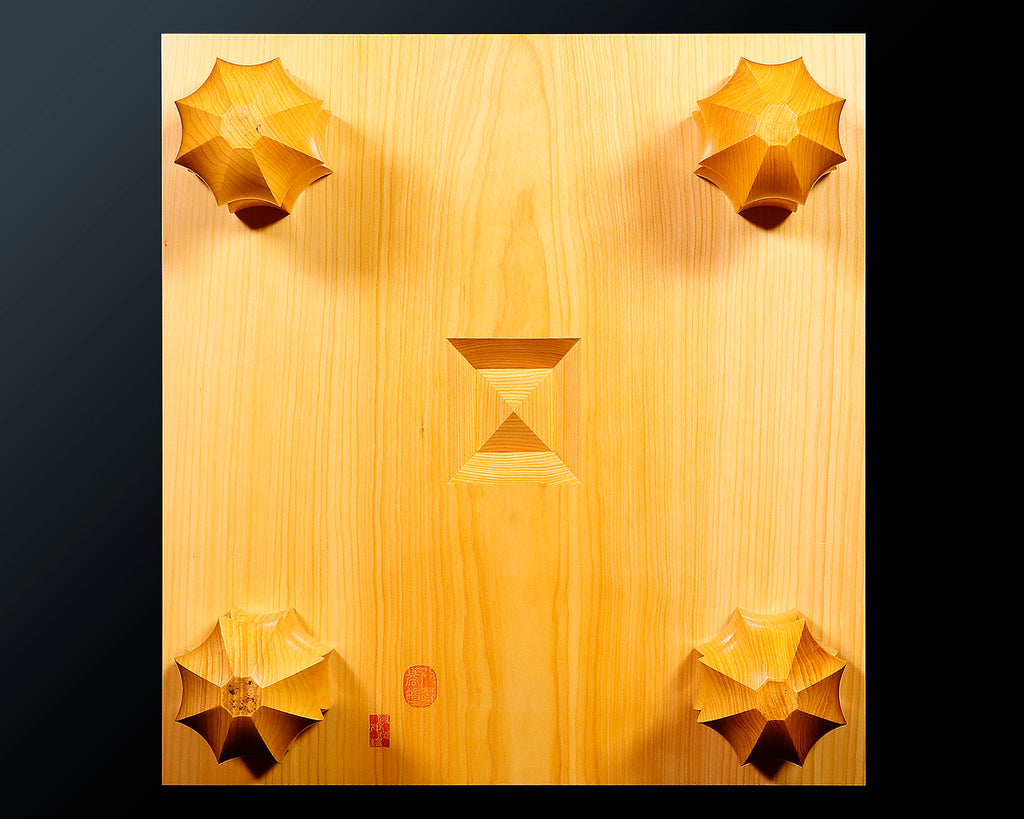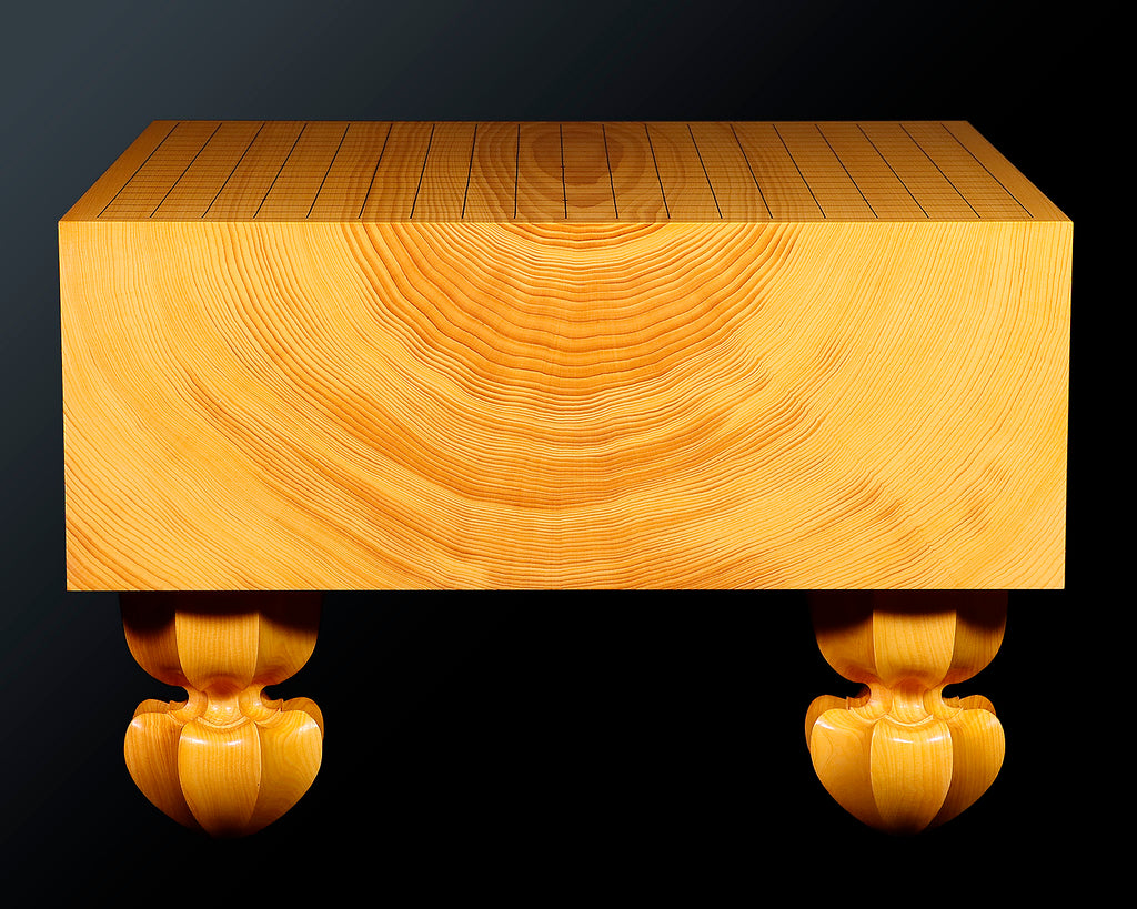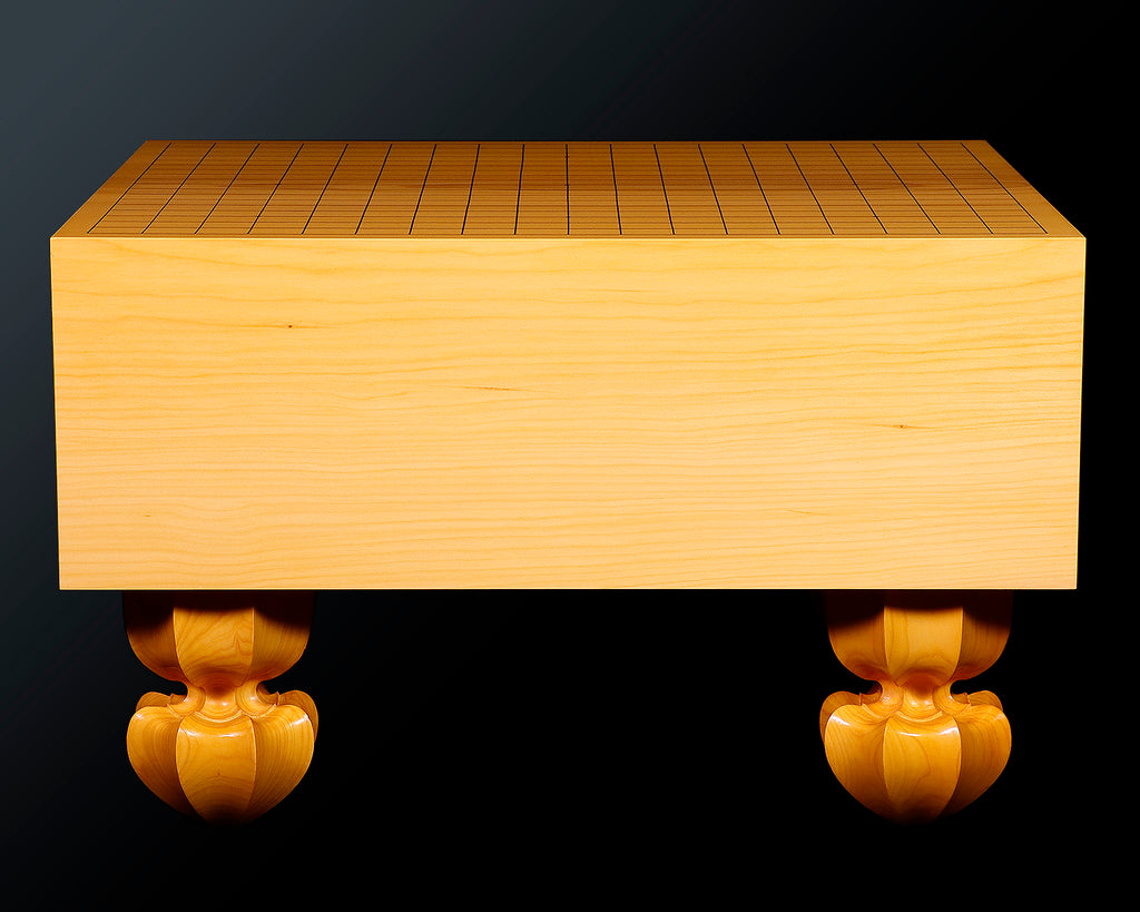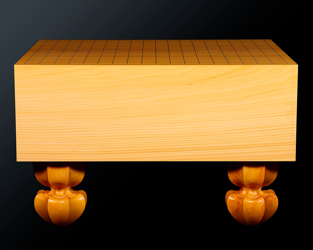 八街(やちまた)碁盤店 盤師 三浦勝巳製作の日本産本榧脚付碁盤 木裏 5.3寸 *歯車盛り仕上げです。日本産榧を専門に、碁盤・将棋盤を製作している「八街(やちまた)碁盤店」 盤師 三浦勝巳製作の脚付碁盤です。底面に、日本産榧の証「日本産榧」と八街碁盤店製作の証「八街碁盤」の落款入りです。木裏盤ではありますが、比較的瑕疵の少ない美麗盤です。ご贈答品、実際の対局にもおすすめです。
