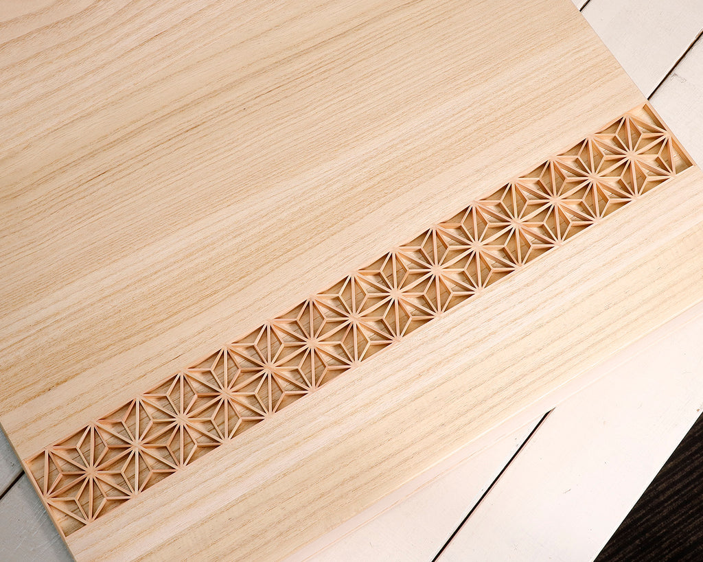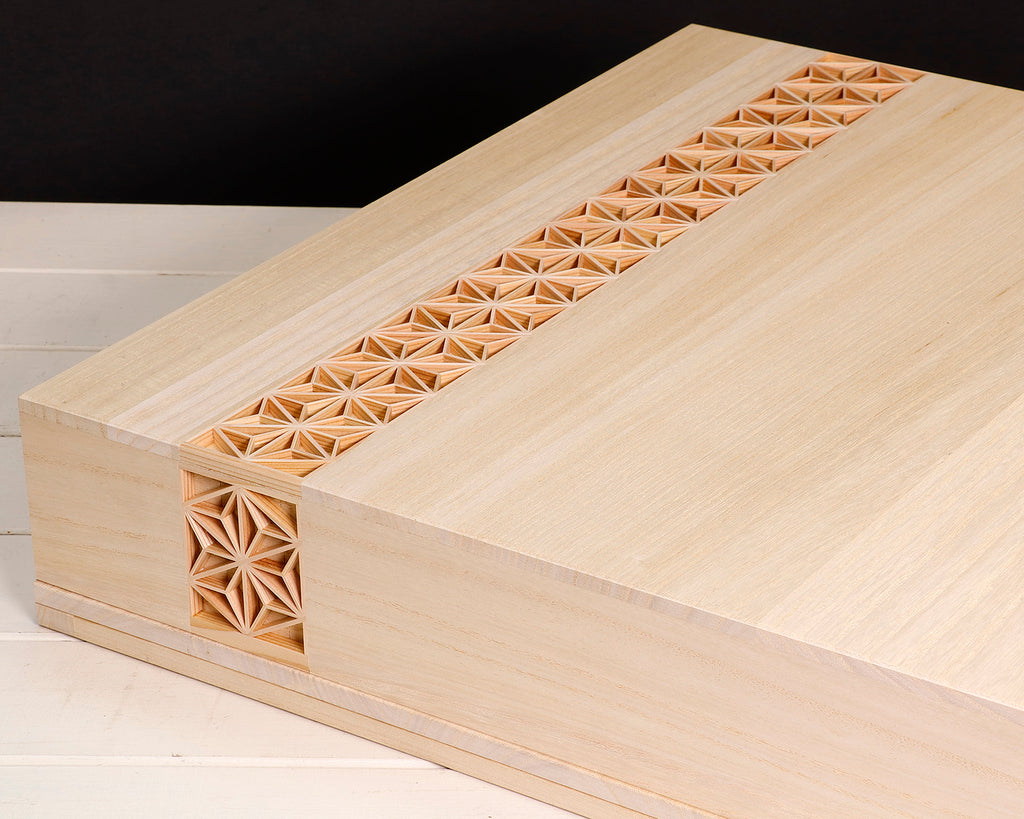 大湊文吉商店・黒木碁石店コラボ商品 組子細工が施された黒木碁石店限定の碁盤用献上箱です。伝統の組子細工は、釘を使わずに木を組み合わせて美しい模様を生み出す技法です。大湊文吉商店と黒木碁石店のコラボから生まれた「組子細工碁盤用献上箱」は、日本の伝統美を感じさせる特別な収納箱です。組子細工は、職人が木を一本一本組み合わせて作り上げる繊細な技法。大切な碁盤を守る実用性はもちろん、見て触れて心が癒される温もりある仕上がりです。自分へのご褒美はもちろん、大切な方への贈り物や記念品にも最適な逸品です。碁盤のサイズが464 mm × 436 mm × 73 mm 以内であれば収納可能です。*真田紐付き*画像をご確認ください。