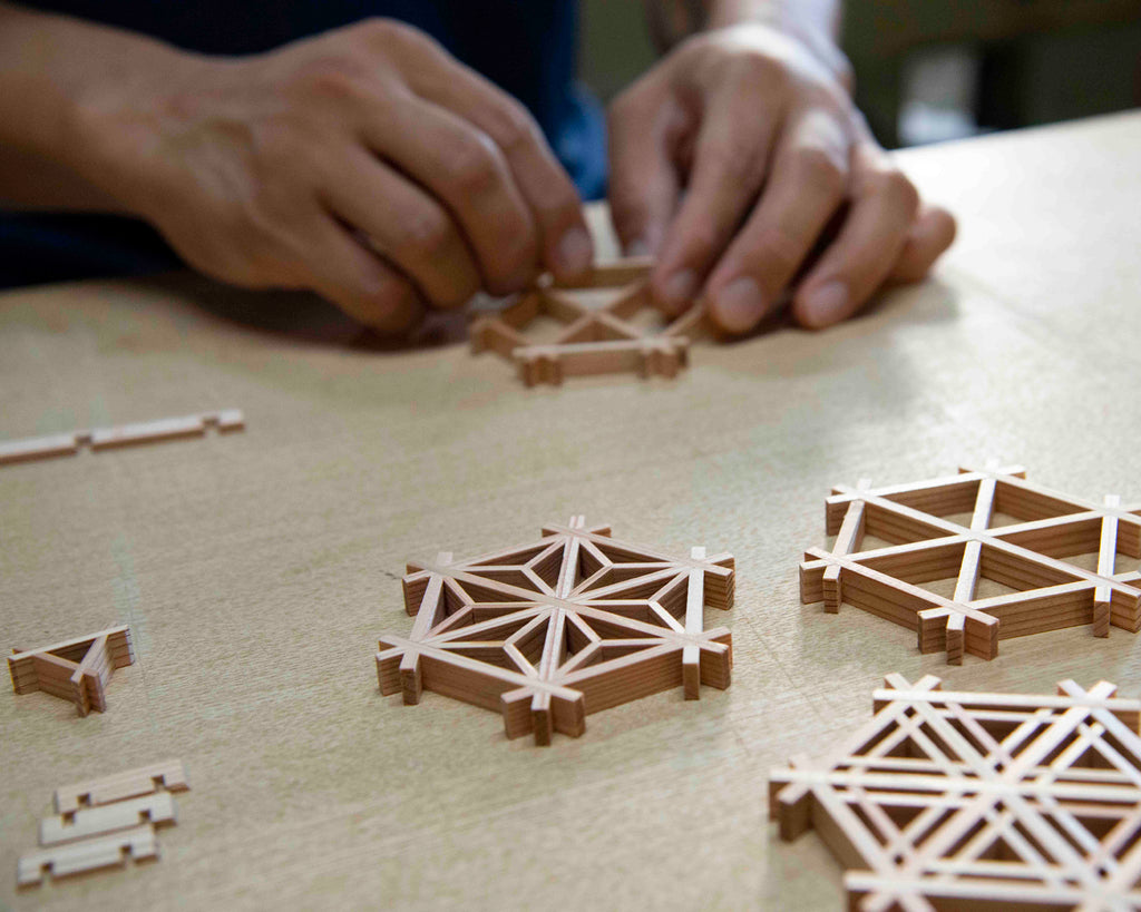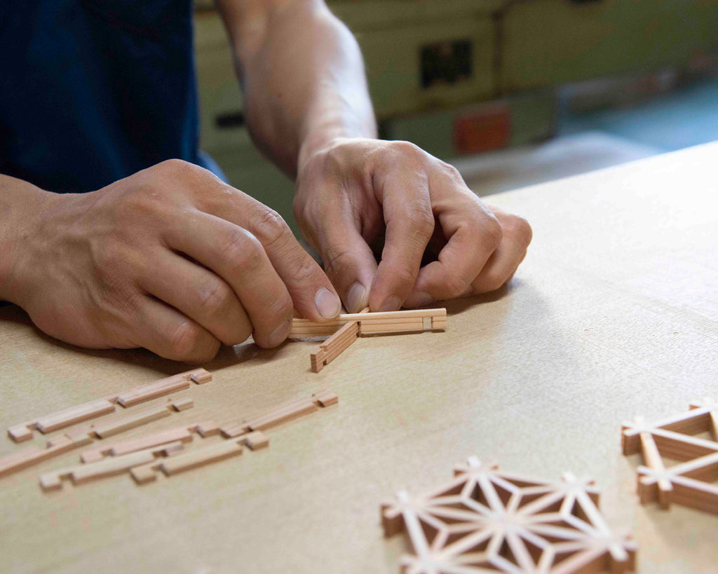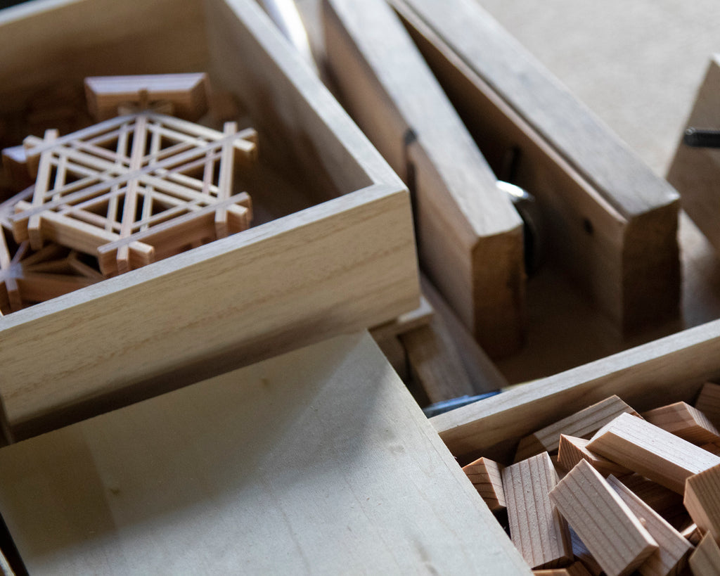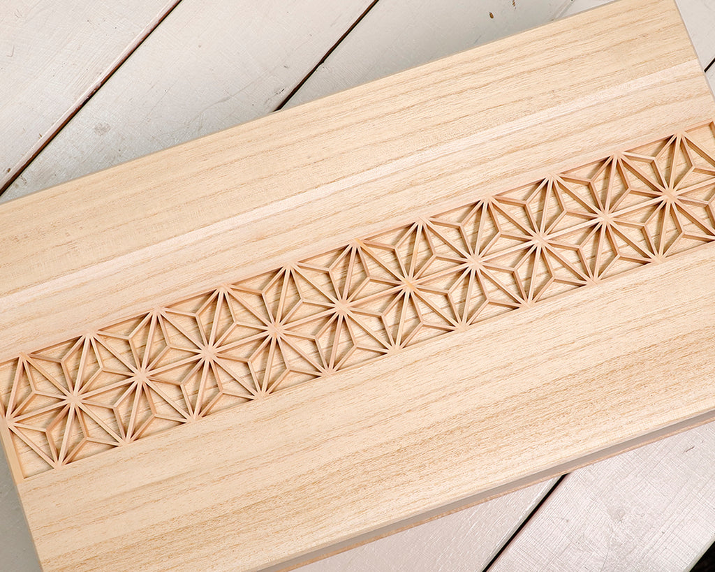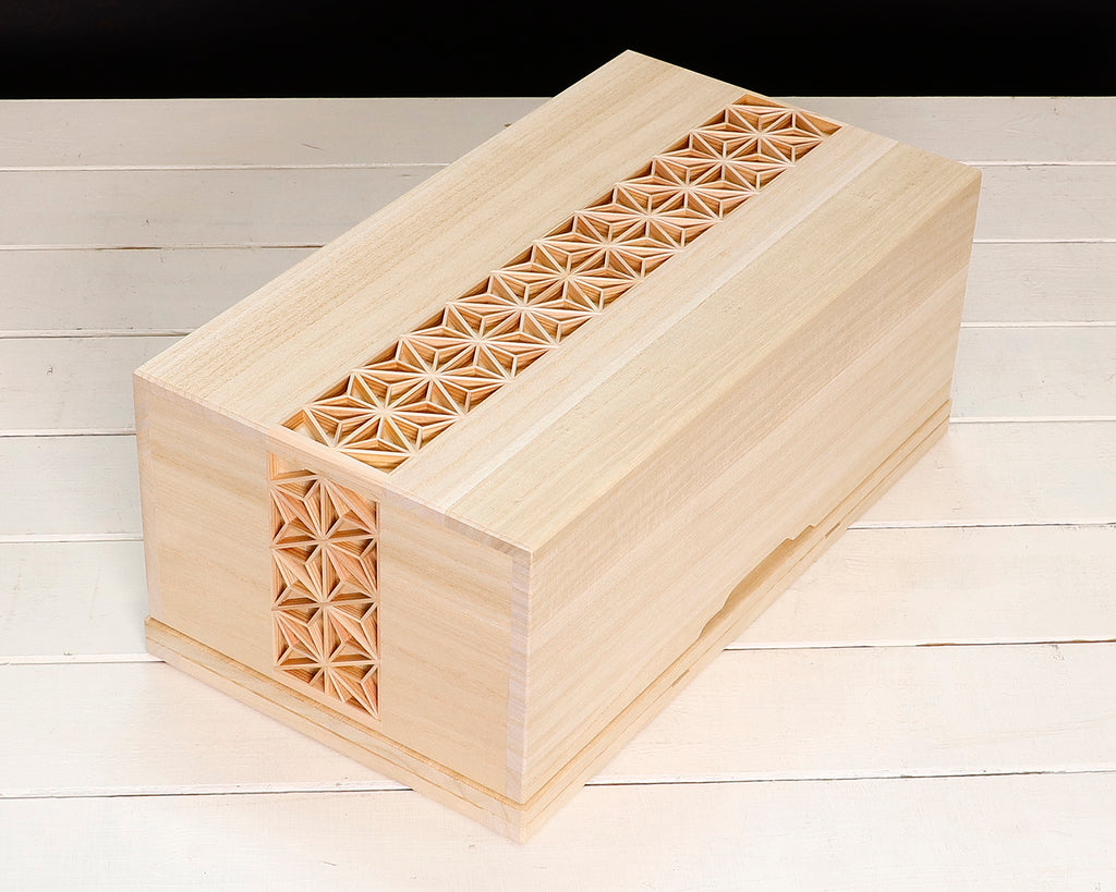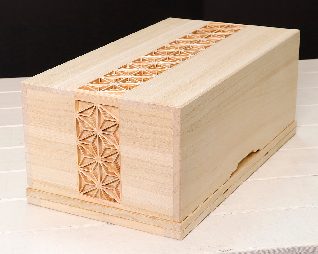 大湊文吉商店・黒木碁石店コラボ商品 組子細工が施された黒木碁石店限定の碁笥箱です。伝統の組子細工は、釘を使わずに木を組み合わせて美しい模様を生み出す技法です。天面と側面一列に施された細工が美しく、碁笥をしまう箱がまるでインテリアのように楽しめます。大切な碁笥を守る実用性はもちろん、見て触れて心が癒される温もりある仕上がりです。ご自宅用としてはもちろん、囲碁好きな方への贈り物にもぴったりです。囲碁時間をちょっと特別にしてくれる、日本の伝統と遊び心が詰まった碁笥箱です。碁笥1個のサイズが165 mm × 165 mm × 120 mm 以内であれば収納可能です。*真田紐付き*画像をご確認ください。