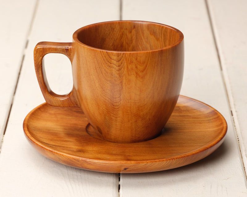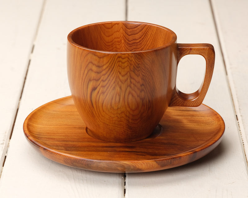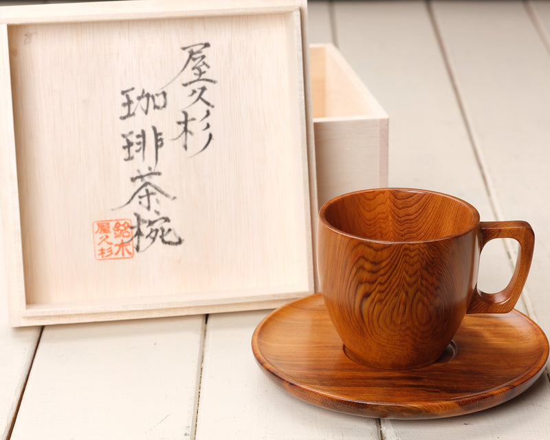 希少な銘木『屋久杉』のカップ&ソーサー1客です。屋久杉特有の複雑な木目模様が非常に美しいカップ&ソーサーです。こちらのカップ&ソーサーは、屋久杉特有の赤茶がかった木色が魅力です。*木箱入りです。自分用としてはもちろんですが、大切な方への贈り物としてもおすすめです。