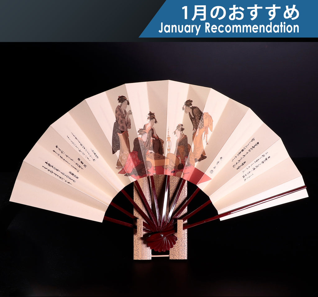 こちらは日本棋院 寛政五美人の対局 飾扇子です。浮世絵師喜多川歌麿の屈指の名品です。江戸時代の五人の美女が碁を打つ様子や対局を観戦する様子が描かれています。竹製の立て掛け付きでしっかりとした作りのとても美しい扇子です。囲碁大会の景品や日常使いのほか、お部屋のインテリアにもおすすめです。