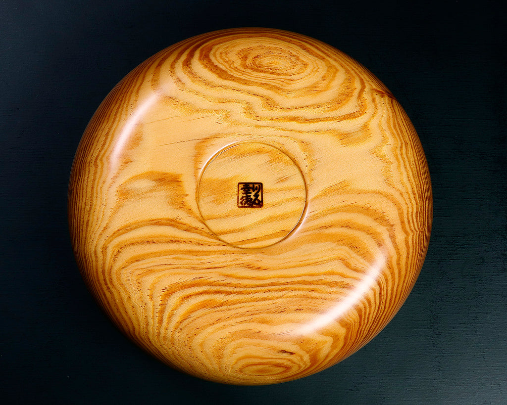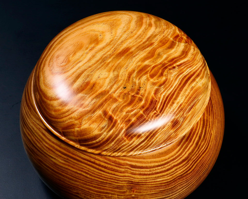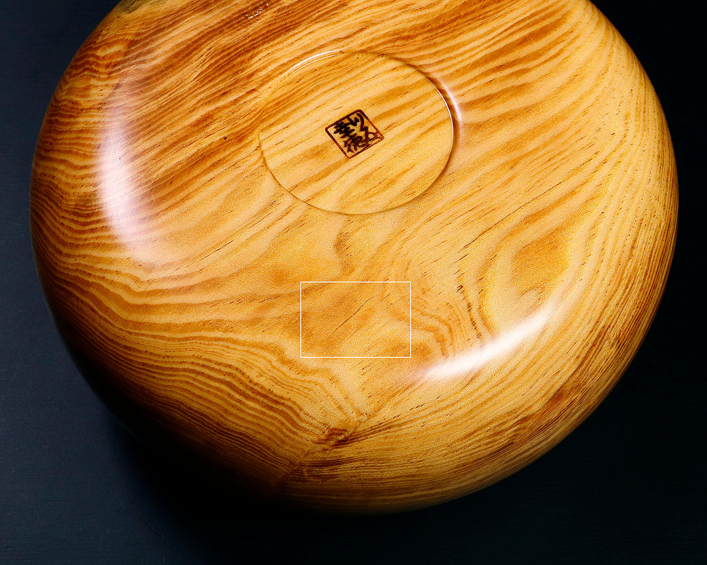 木工工芸家 川下幸徳(かわした ゆきのり)氏製作の「松材碁笥」 *訳有品です。42号の碁石まで入ります。こちらの碁笥は、ほとんど市場に流通していない、希少な松材製の碁笥です。松材製の碁笥は、日本の伝統的な木工素材として古くから親しまれてきた松の魅力を存分に生かした逸品です。明るく黄味を帯びた木肌には力強い年輪が浮かび上がり、自然の温もりを感じさせる優しい表情を持っています。耐久性にも優れているため、実用性と美観を兼ね備えた素材です。松特有の樹脂分によって生まれる艶や香りは、長く使うほどに味わいを深め、時間とともに美しい飴色へと変化していきます。高級材の重厚さとはまた異なる、親しみやすく温かみのある魅力を持つ碁笥です。*現品限りです。*残念ながら、底面に複数のヒビがございます。*画像をご確認ください。