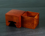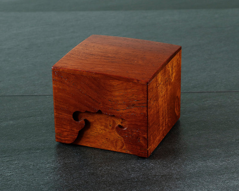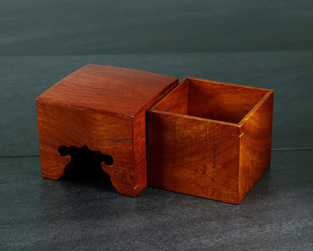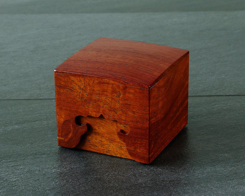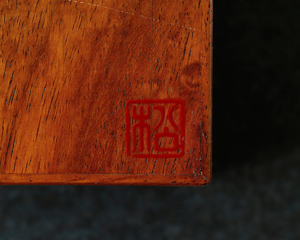 名工 松浦清治師の作品「紫檀製 駒箱 天ムクリ」拭き漆仕上げです。松浦清治氏は、名人戦でも使用された実績のある木工職人です。こちらの駒箱は、古来より「三大唐木」と呼ばれ高級材として知られている紫檀製の駒箱です。その材質は非常に硬く、耐久性に極めて優れています。木色は暗赤紫褐色で、落ち着いた見た目の美しさと実用性を兼ねそなえた木材です。紫檀材は、比較的重い素材ですので、駒箱だけの重さが300gを超えます。天板はわずかに丸みをつけた天ムクリ仕上げです。底面に木工職人「松浦」作の落款入りです。*底面に素材由来の細かな黒い凹みの部分、キズがございます。*画像をご確認ください。