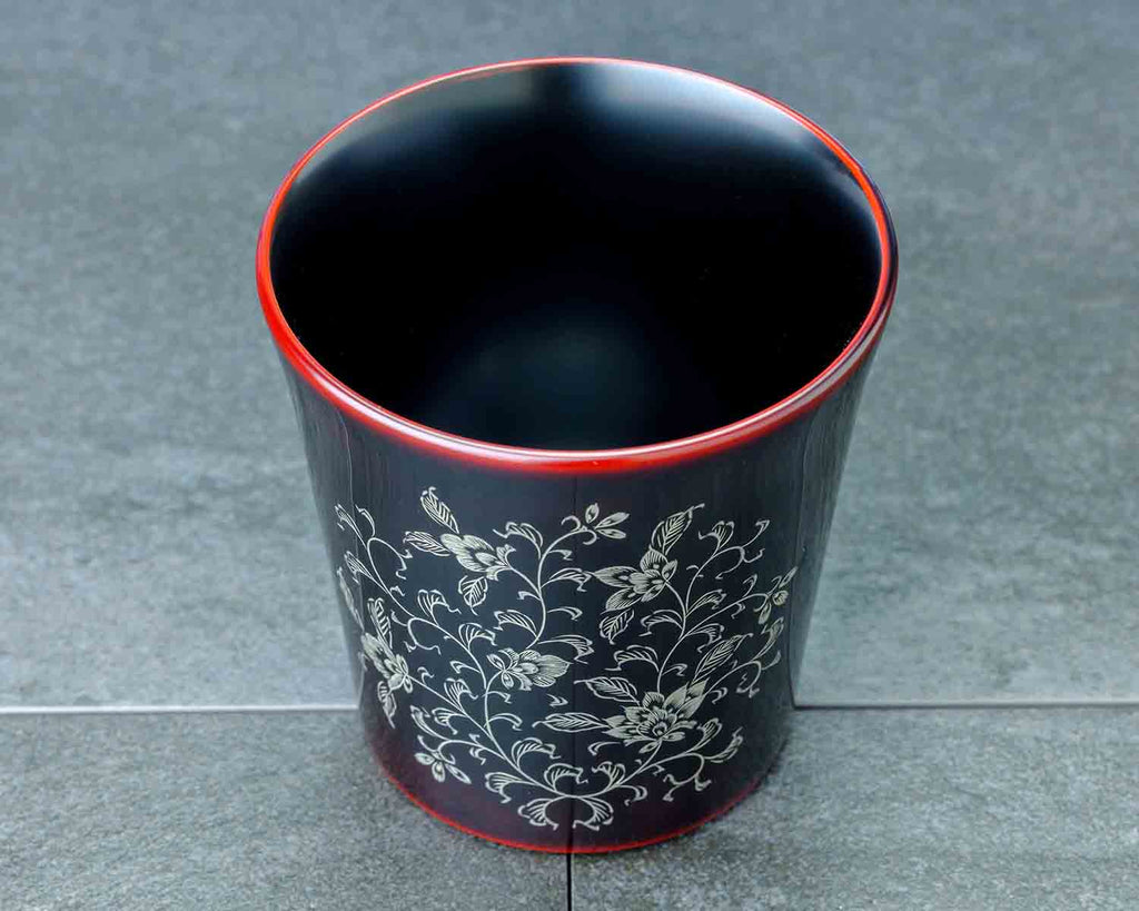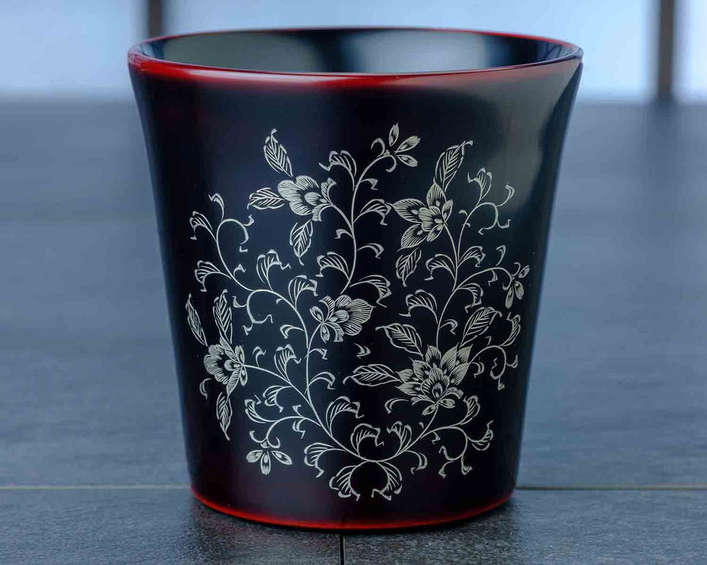 こちらは、輪島塗の伝統技法で仕上げられたフリーカップ 宝相華です。「輪島塗(わじまぬり)」は、石川県輪島地方で受け継がれる漆塗りの伝統技術です。精巧なつくりで丈夫なのはもちろん、優美で華麗かつ繊細な加飾が特徴です。上品な艶をまとった黒漆に、繊細な銀の宝相華模様が浮かぶカップです。ほんのり透ける朱が深みを添え、落ち着いた華やかさを感じさせます。冷酒やお茶、ワインにも使いやすいサイズで、和洋問わず食卓になじみます。伝統の技が息づく美しいデザインは、贈り物にもおすすめです。