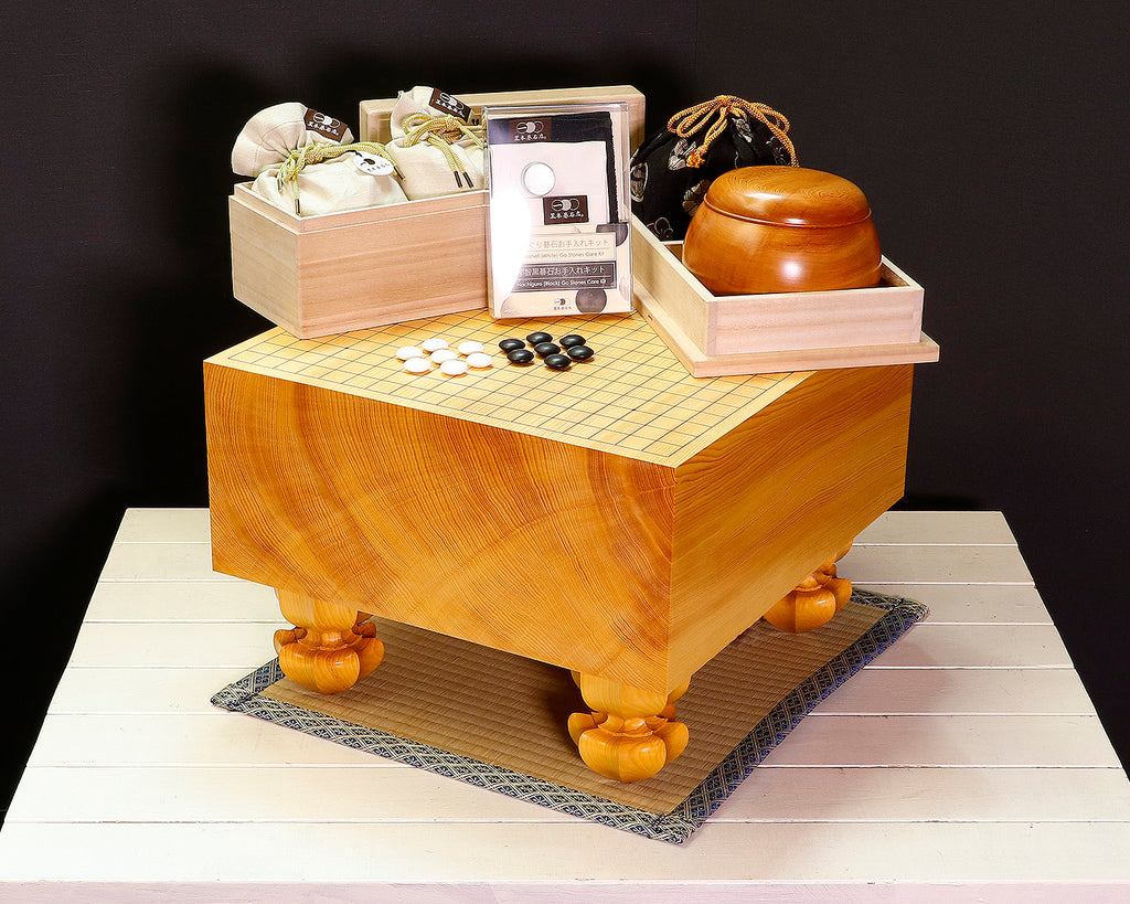 盤師 三輪京司製作脚付碁盤と木工工芸家 川下幸徳氏製作 屋久杉碁笥、はまぐり碁石厳選雪印34号に碁笥箱、碁笥袋、畳マット、碁石お手入れキットが付属した、超豪華囲碁セットです。