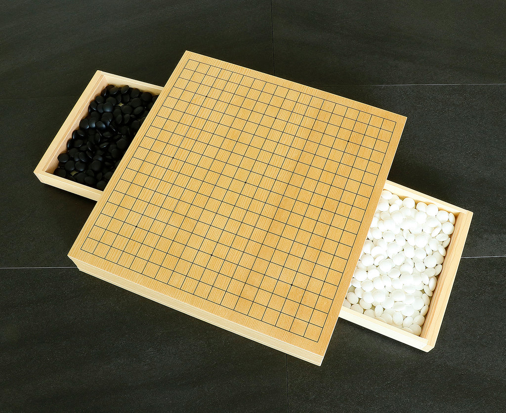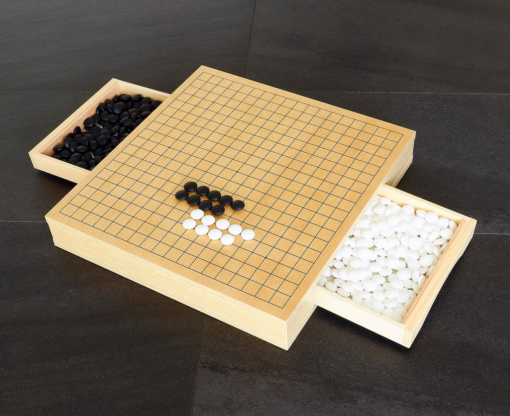 通常の碁盤の約80%サイズの碁石収納引き出し付き卓上碁盤と、直径17mm碁石の囲碁セットです。