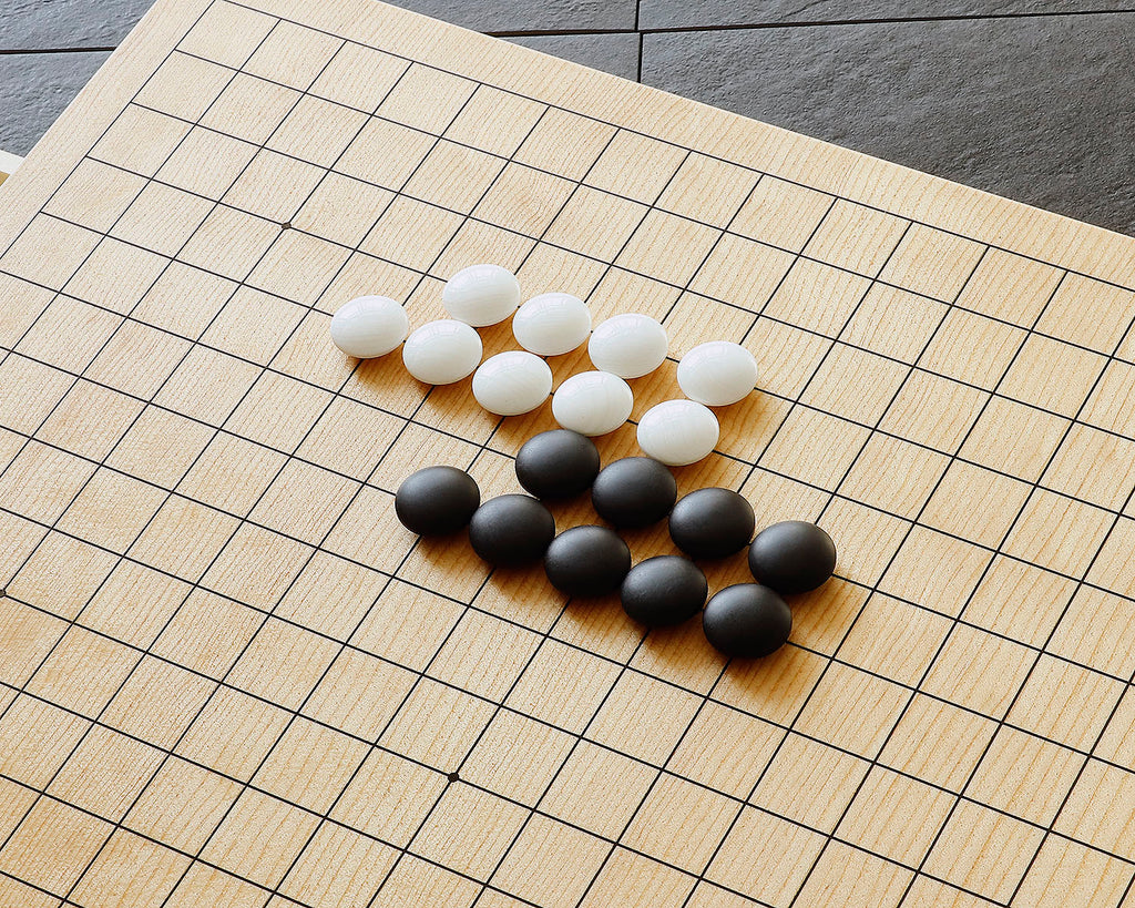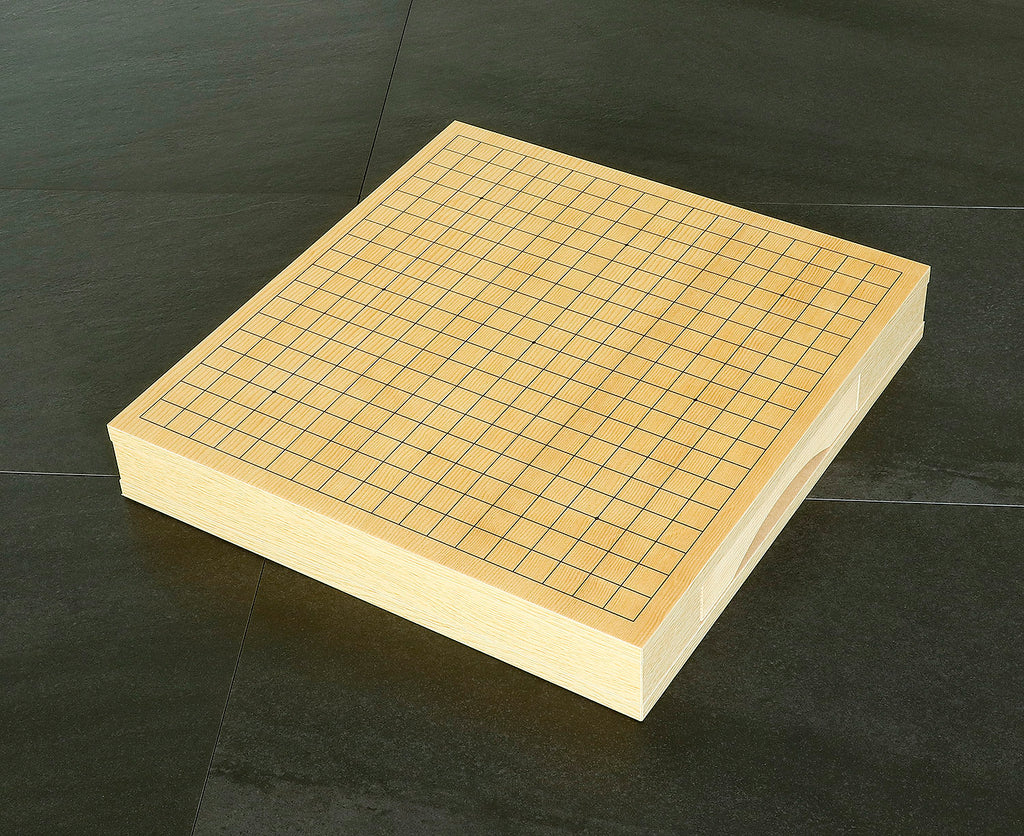 碁盤の素材:MDF(中密度繊維板と呼ばれ、細かく粉砕した木材等を板状に成形したものです。)材に、スプルース材を貼り合わせて製作されています。