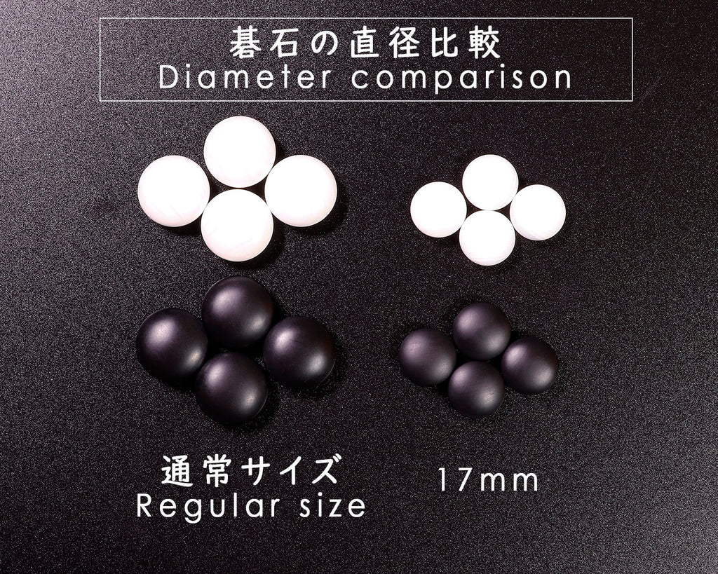 碁石比較 直径17mmのはまぐり白碁石、那智黒碁石が付属しています。