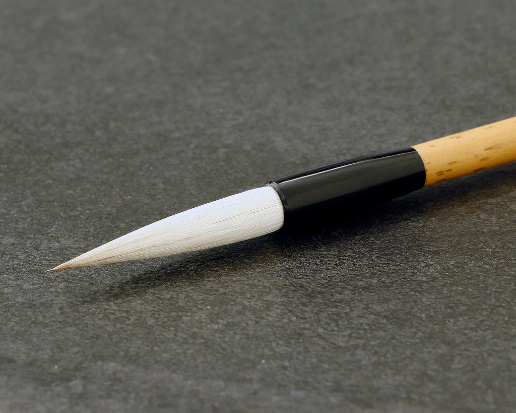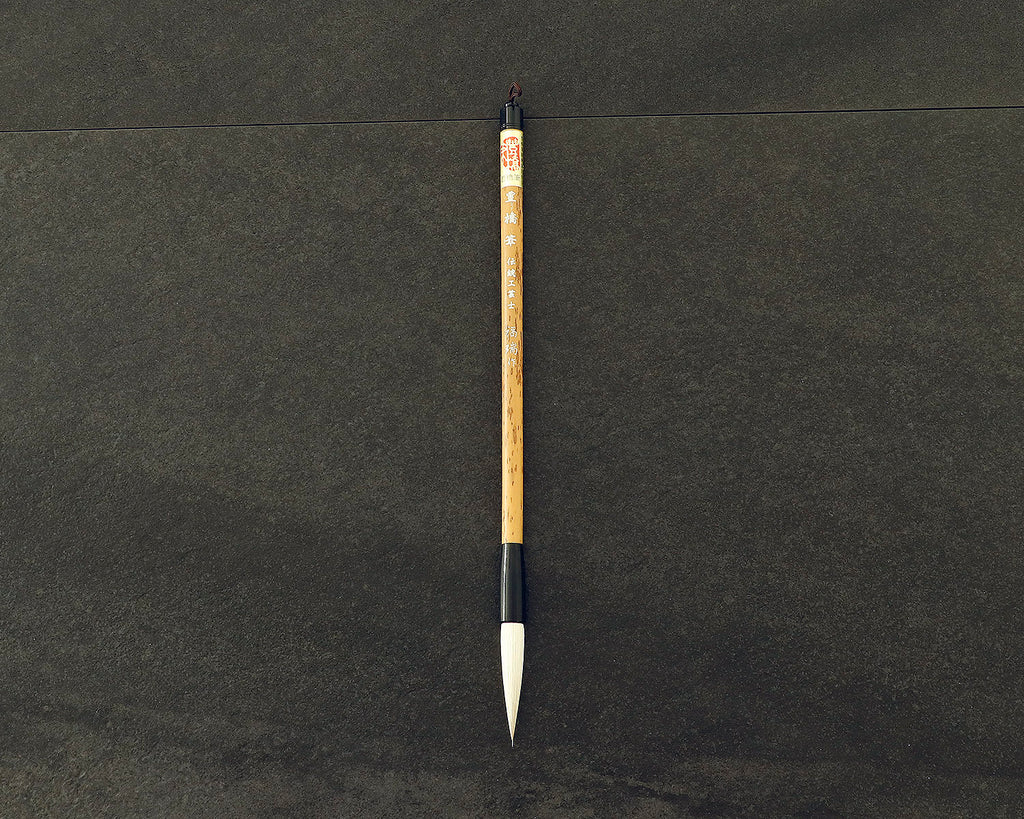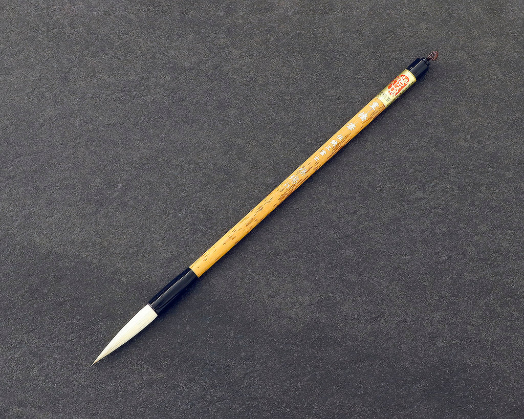 伝統工芸士「福瑞(川合 福男)」作 豊橋筆 兼毫筆六号です。「豊橋筆」は、愛知県豊橋市とその周辺地域で製造されている、主に書道用の筆です。筆の品質、墨含み、書き味の良さなどが高く評価され、多くの書道家に愛用されています。こちらの「兼毫筆六号」は、弾力のある「馬の尾脇毛」と墨含みの良い柔らかい「山羊毛」を混ぜ合わせて作られた「兼毫」の六号筆です。半紙に4~6文字程度の楷書や行書、臨書に適していて、硬すぎず、適度な腰と弾力があるため、コントロールしやすく、書き心地の良い筆です。*「馬の尾脇毛(おわきげ)」とは?馬の尻尾の付け根(尾の根元)に生えている、短くて密集した毛のことで、コシと弾力性に優れ、柔らかさと力強さを両立するため、特に質の良い書道筆や高級な洋服ブラシ、化粧筆などに少量ながら貴重な材料として使われています。「馬の尾脇毛」は、「天尾(あまお)」の一部とされ、きめ細かさで他の部位の馬毛とは異なる特性を持ち、繊細な表現やしなやかな使い心地を生み出します。硬い毛と柔らかい毛の長所を生かし、程よい腰(弾力)と墨含みの良さを両立した書き味が特徴です。穂丈約44㎜、直径7㎜、筆先を含む長さは約255㎜です。*画像はサンプルです。同等品をお送りいたします。
