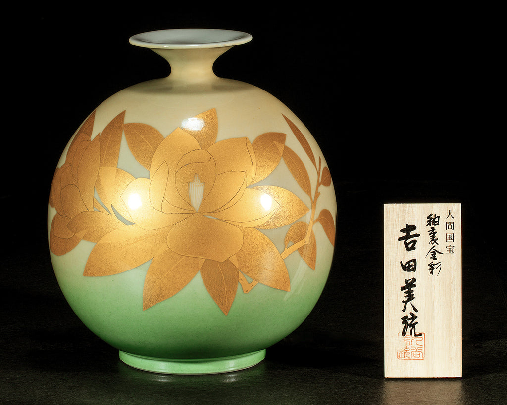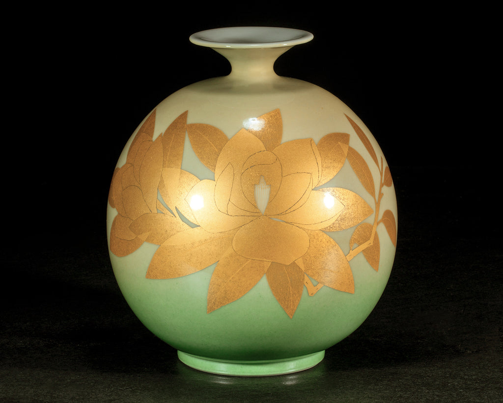人間国宝 吉田美統(よしだ みのり)作、九谷焼最高峰の技法「釉裏金彩(ゆうりきんさい)」による、気品と格調を極めた花器 飾壷「泰山木」7号です。