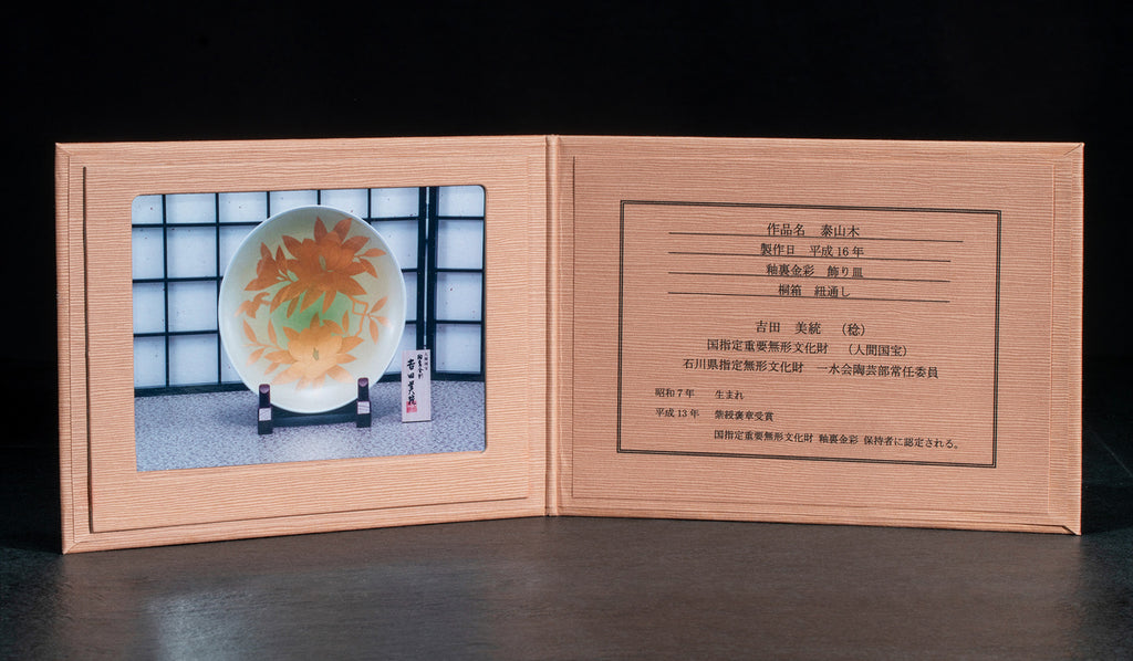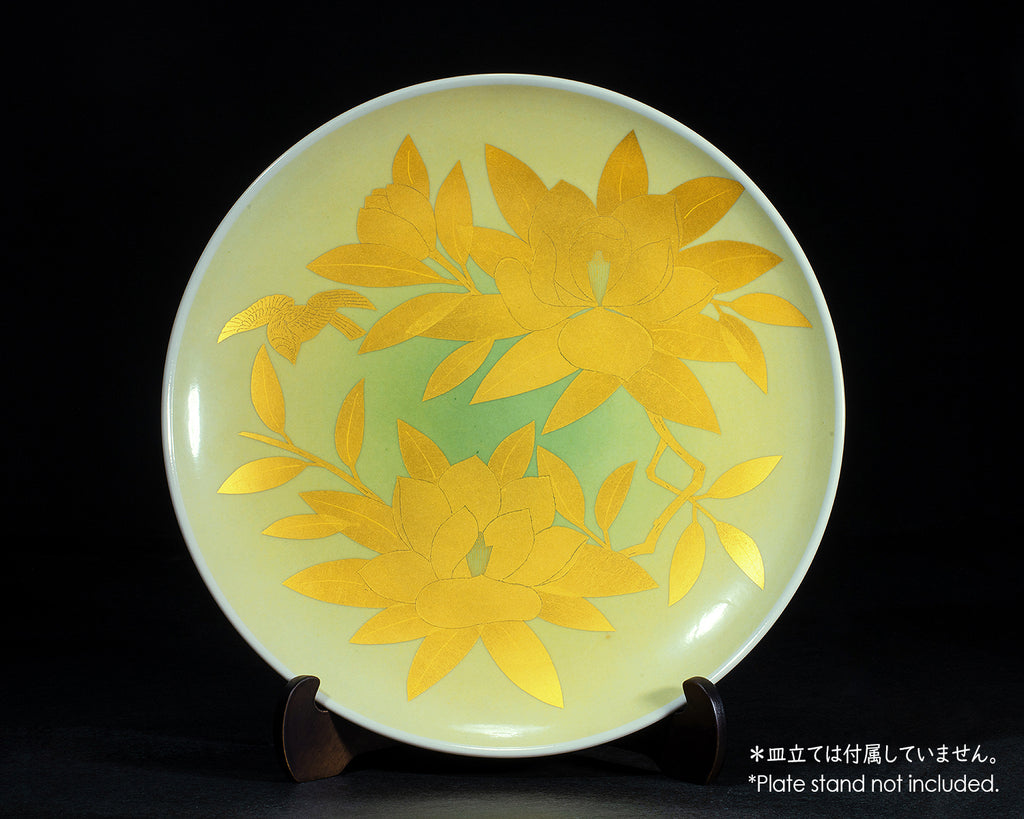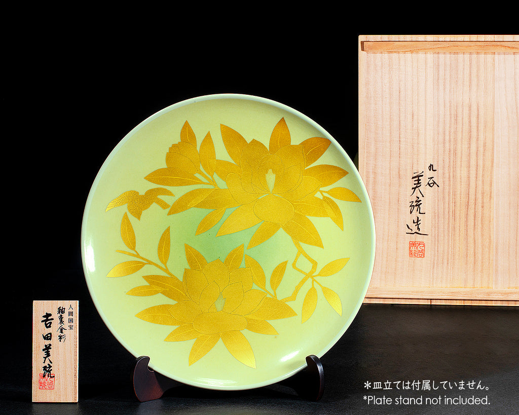 人間国宝 吉田美統(よしだ みのり)作、九谷焼最高峰の技法「釉裏金彩(ゆうりきんさい)」による、格調高く華麗な大皿「泰山木」11号です。大輪の白花を咲かせる泰山木(たいざんぼく)は、古来より高潔・威厳・繁栄の象徴とされ、縁起の良い意匠として親しまれてきました。本作品では、伸びやかで力強い構図の中に、泰山木の清冽な美しさを、緻密かつ流麗な描線で描写。釉薬の下に施された純金彩は、焼成を経て釉層の奥から深い輝きを放ち、光の角度によって表情豊かに変化します。直径約33cmに及ぶ11号の大皿は、画面いっぱいに展開される意匠によって、まるで一幅の絵画のような迫力と鑑賞性を実現。床の間や飾り棚、壁面ディスプレイなど、空間の主役として圧倒的な存在感を放ちながらも、上品で格調高い佇まいが、周囲と美しく調和します。釉裏金彩の第一人者・吉田美統氏の卓越した技と美意識が結実した、九谷焼芸術の粋を体現する至高の一枚。美術工芸品として末永くご愛蔵いただける、格別の逸品です。*現品限りです。*揮毫、落款入り桐箱(真田紐付き)、立札が付属しています。