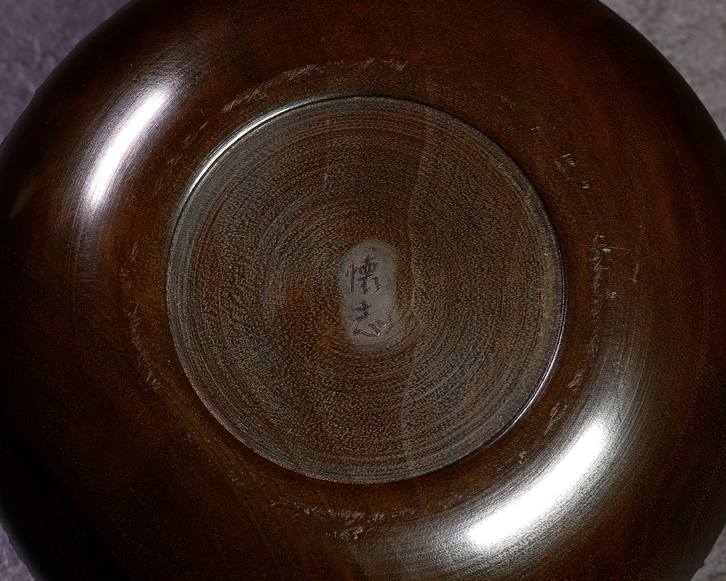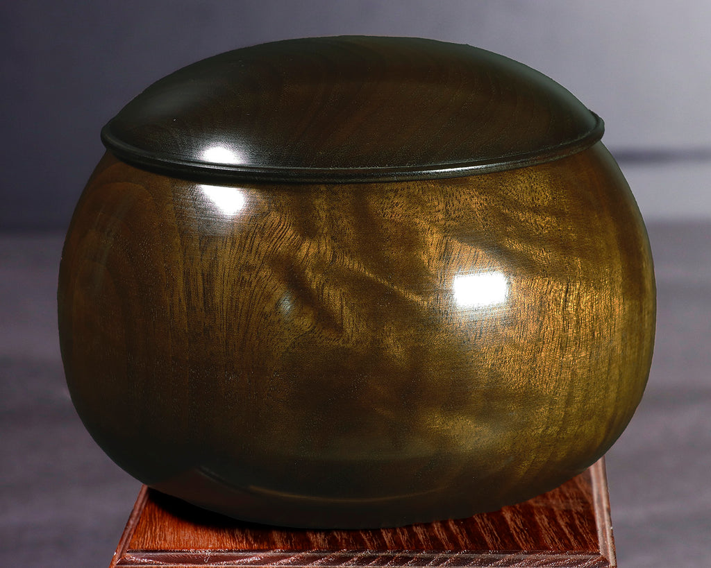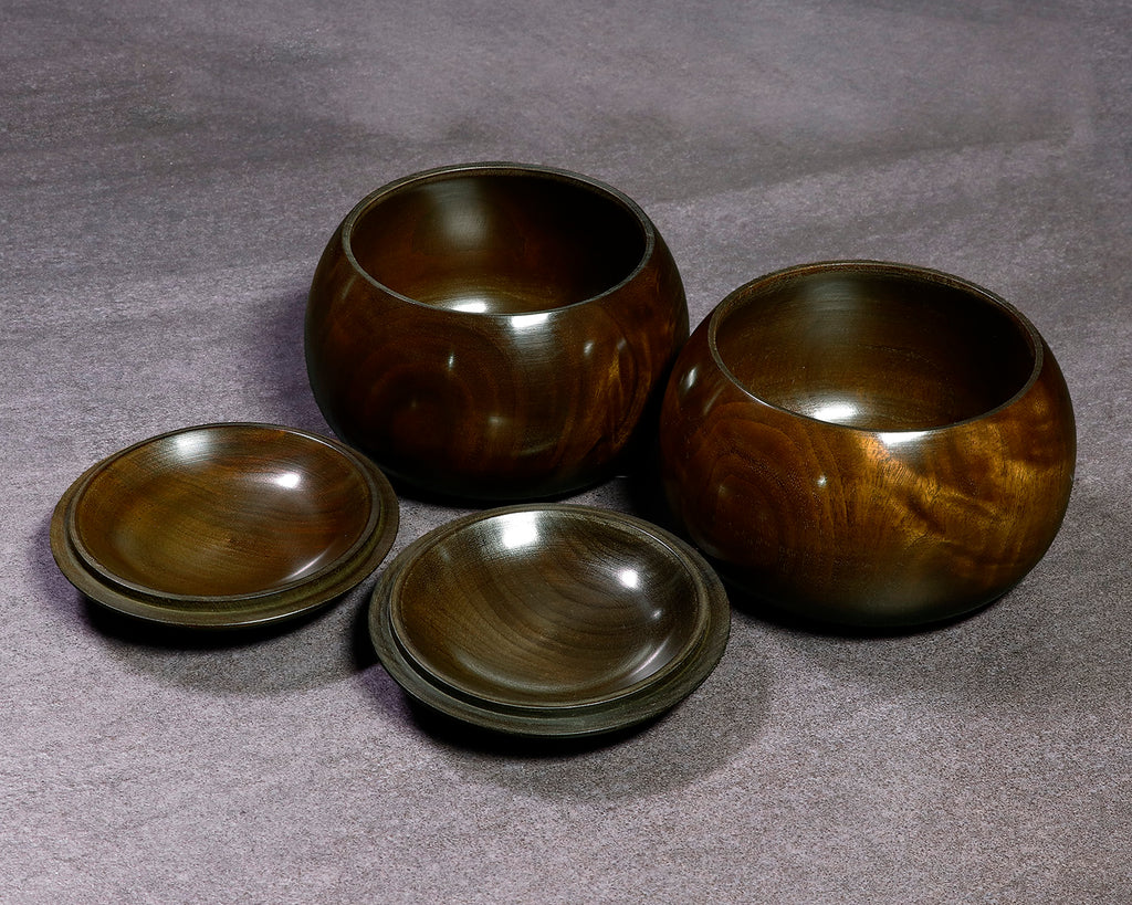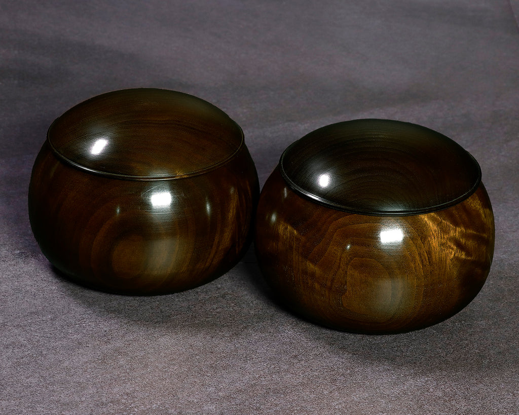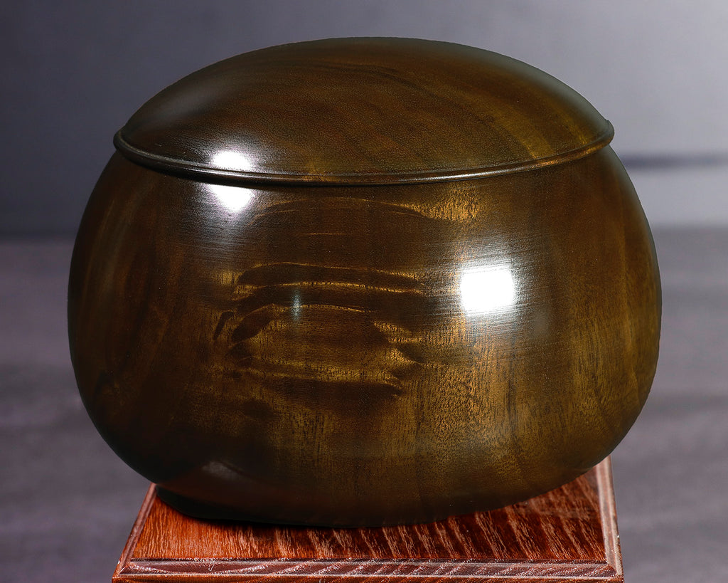 木工挽物職人 懐志製作の「楠(くす)」碁笥 特大 杢入り ~36号碁石用です。楠(くす)は、日本を代表する広葉樹のひとつで、古来より家具や建築材、工芸品に広く用いられてきた素材です。楠材は適度な硬さと軽さを兼ね備え、加工性に優れているため、木工職人にも愛されてきました。楠材の特徴は、爽やかで独特な芳香と、やや緑掛かった黄褐色の木色、流れるような美しい木目が魅力の一品です。適度な硬さと粘りを持つ楠は耐久性に優れ、自然な風合いと温かみが碁石をやさしく引き立てて、落ち着いた雰囲気を演出します。また、「楠」材は、防虫・防腐効果が高い「樟脳(しょうのう)」が採取できる木材ですので、清涼感のある独特の香りがします。使い込むほどに艶が増し、風合いの変化もお楽しみいただける、実用性と趣を兼ね備えた碁笥です。器側面に「杢(もく)」が入った美しい碁笥です。*底面に「懐志」焼き印入り。*画像をご確認ください。*36号の碁石まで入ります。◎「懐志」の碁笥製作の動画をご覧いただけます。*動画(日本語版、英語版)は、画像一覧にございます。ぜひ、ご覧ください。
