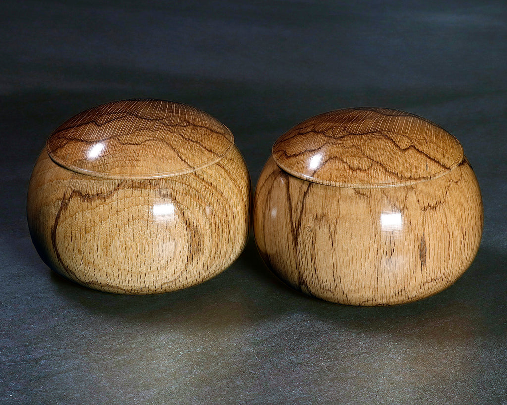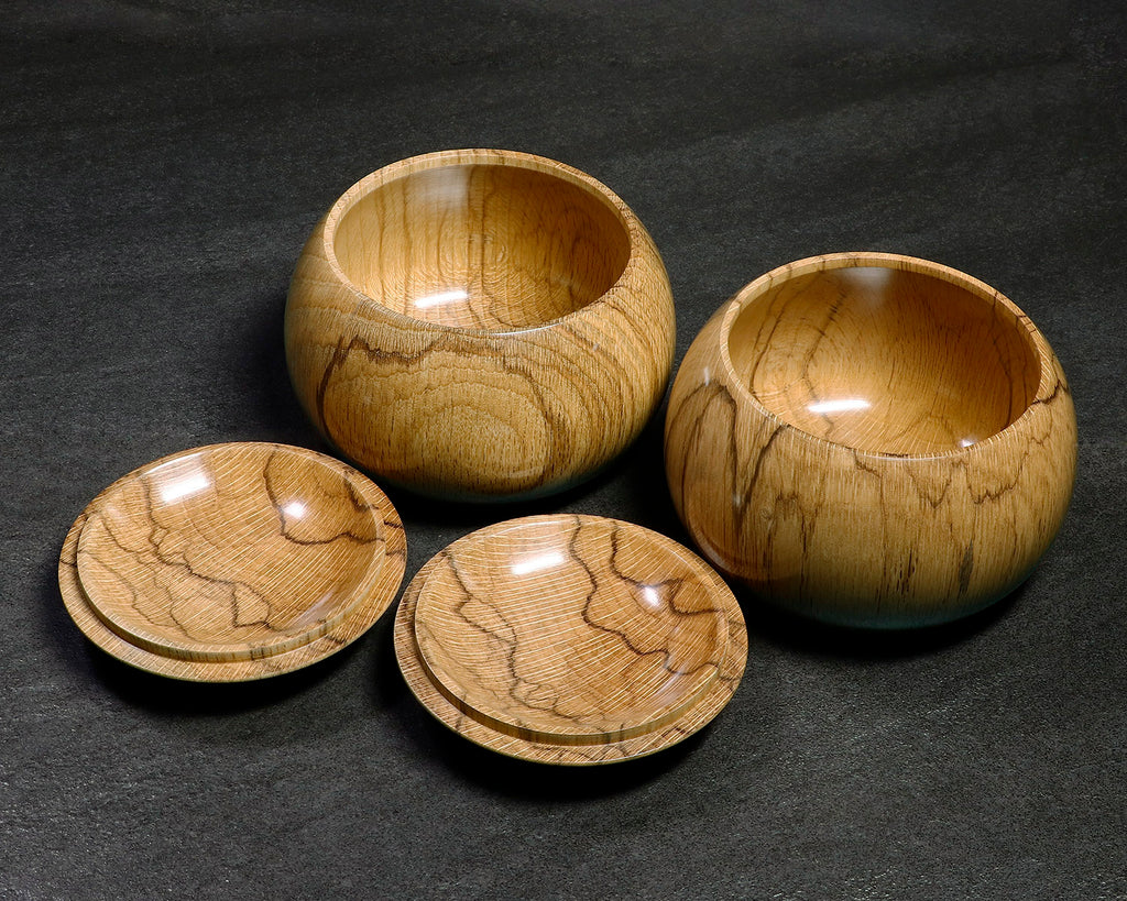 木工挽物職人 懐志製作の碁笥素材としてはとても珍しい「樫(かし)」碁笥 特大 ~38号碁石用です。樫材特有の「牡丹(ぼたん)模様」と呼ばれる細い筋状の模様が美しい碁笥です。「樫」材の模様は、同じような模様の黒柿ほど黒くはなく、薄墨で引かれたような線が特徴です。樫材製の碁笥はほとんど市場に出回っていないため、珍しい碁笥をお探しの方や、コレクターの方におすすめです。*底面に「懐志」焼き印入り。*画像をご確認ください。*38号の碁石まで入ります。◎「懐志」の碁笥製作の動画をご覧いただけます。*動画(日本語版、英語版)は、画像一覧にございます。ぜひ、ご覧ください。